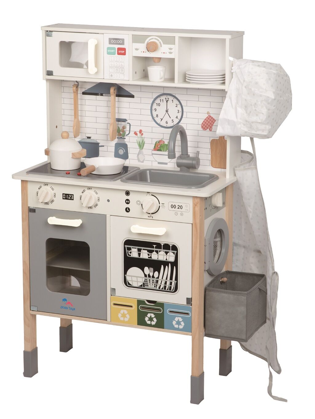 Chcete čerstvý koláčik priamo z pece? Alebo snáď máte zálusk na niečo vyprážané? S touto kuchynkou môžete mať menu, aké sa Vám zapáči. Je totiž plne vybavená! Nájdete tu všetko, čo v žiadnej modernej kuchyni nesmie chýbať - sporák s rúrou, umývačku riadu, mikrovlnku, drez, kávovar a samozrejme riad s náradím, ako sú taniere, hrniec, panvicu, hrnček a ďalšie. Na bočnej strane kuchynky je umiestnená práčka, z ktorej je možné vypranú bielizeň uložiť do zaveseného odnímateľného košíka. Ani zadná strana kuchynky nezostala nevyužitá. Na praktickú čiernu tabuľu môžu deti napísať odkaz, spísať suroviny receptov alebo niečo nakresliť. Ako inšpirácia im napríklad poslúži zábavná mapa so zvieratkami, ktorá je tiež zozadu. Tak si nasaďte kuchársku čiapku, oblečte praktickú zásteru a môžete začať variť. Keďže nám záleží na planéte nesmieme tiež zabudnúť na koše na triedenie!