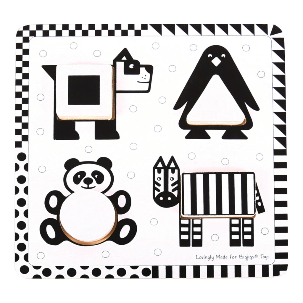 Toto drevené puzzle bolo špeciálne navrhnuté v čiernej a bielej farbe, pretože čierna a biela sú pre najmenšie deti najľahšie rozoznateľné a reagujú na ne. Každý zo štyroch dielikov puzzle je možné zasunúť do miesta na doske s ilustráciou zvierat a pomôže vášmu dieťaťu vo vývoji, keď sa naučí každý z nich identifikovať a umiestniť. Každý masívny drevený dielik puzzle má veľkorysú veľkosť, aby ho malé ručičky ľahšie zdvihli, uchopili, preskúmavali a vymieňali. Pomáha rozvíjať zručnosť, zmyslové zručnosti a koncentráciu. Vyrobené z vysoko kvalitných, zodpovedne získaných materiálov. Spĺňa aktuálne európske bezpečnostné normy. Obsahuje 4 dieliky puzzle.