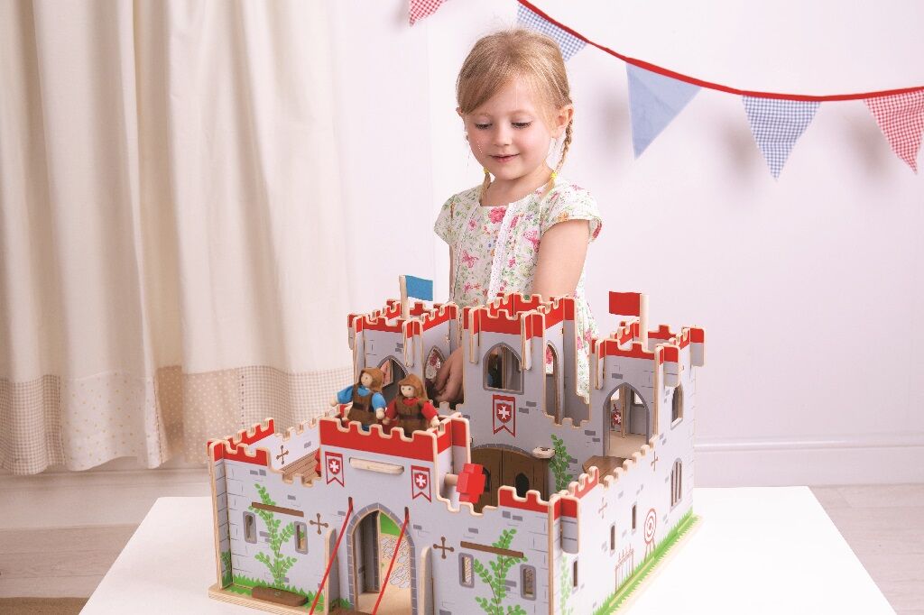 Drevený hrad kráľa George obsahuje plne funkčný padací most, balkóny a pohyblivé dvere. Nájdete tu aj tajné dvere, ktorými rytieri vykĺznu von bez toho, aby ich zbadal nepriateľ! Majte hrad pod kontrolou vďaka padaciemu mostu, vymieňajte červené a modré vlajky podľa toho, kto hrad dobyl. Užívajte si magickú hru, nezabudnite ale byť stále v strehu! Jednoducho zložte drevené dieliky do seba a dobrodružstvo môže začať. Je to skvelý spôsob ako rozvíjať rozprávačské zručnosti, slovnú zásobu a zručnosť u detí. Vyrobené z kvalitných materiálov zo zodpovedných zdrojov. Postavičky nie sú súčasťou balenia, dajú sa dokopiť.