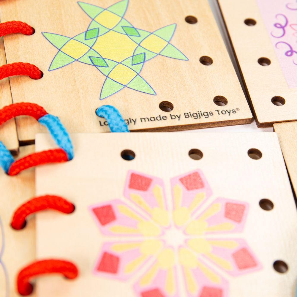 Prešnurujte drevené šnurovacie obrázky a vytvorte krásnu drevenú patchworkovú koláž! Šnurovacie hry sú fantastickým spôsobom, ako rozvíjať jemnú motoriku, kreativitu a obratnosť detí, keď preťahujú šnúrky otvory v drevených obrázkoch.
