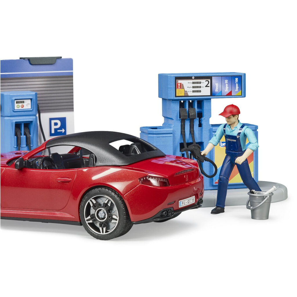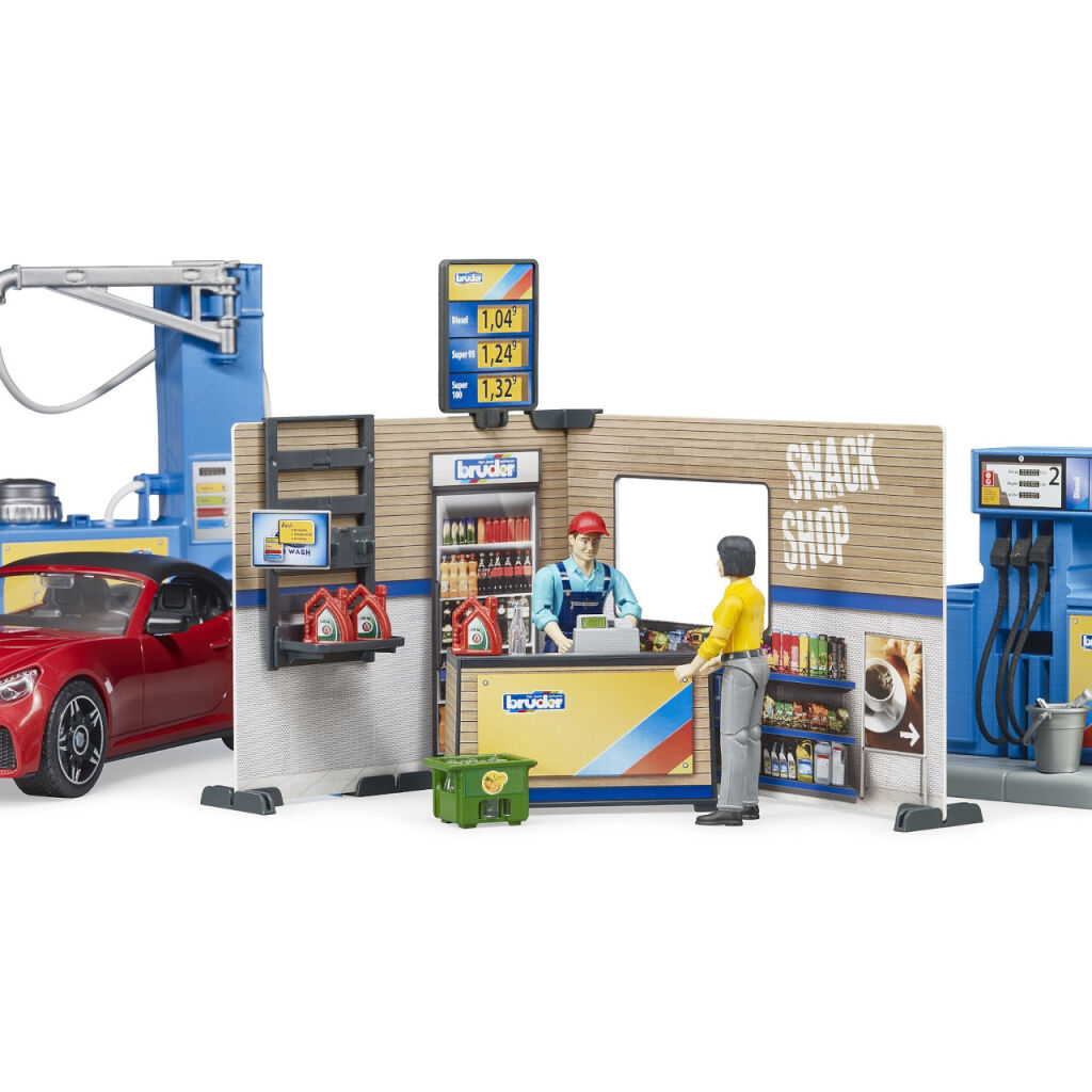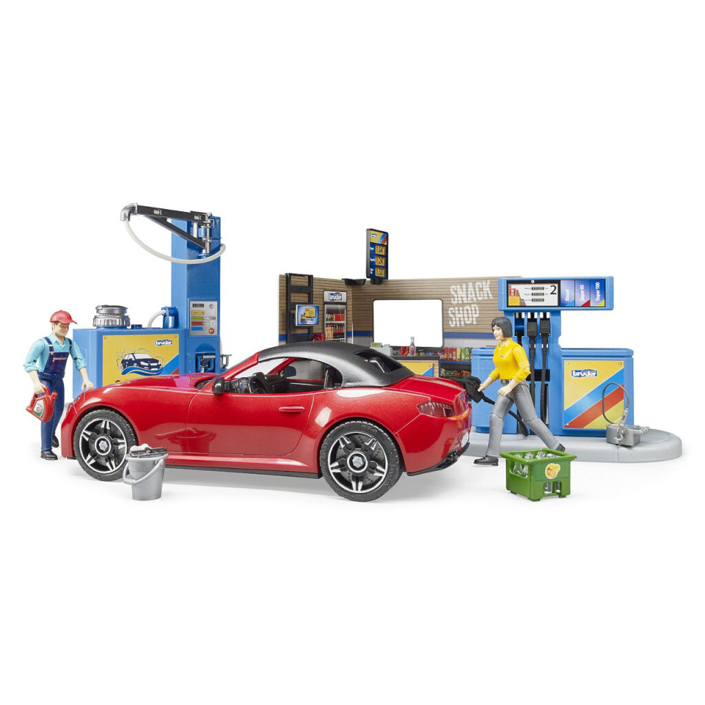 Každé auto Bruder predsa potrebuje mať kde natankovať, alebo sa nabiť. A nielen to, vodič sa predsa tiež potrebuje občerstviť a privíta možnosť svoje auto aj umyť. Vhod pritom určite príde ústretová profesionálna obsluha. S modelom čerpacej stanice sa všetky tieto možnosti ponúkajú. Umývacia linka je pritom plne funkčná, stačí doplniť vodu do zásobníka a stlačiť tlačidlo! Kulisy stanice sú detailne obojstranne potlačené a opatrené funkčnými podrobnosťami, policou s kanistrami a cenníkom. Súčasťou sady je aj ďalšie drobné príslušenstvo, prepravka, parný čistič a vedro so stierkou na umývanie okien. Variabilné športové auto má odnímateľné kolesá aj strechu a je samozrejme kompatibilné s figúrkami Bruder BWORLD. Vyrobené v Nemecku, z kvalitných materiálov.