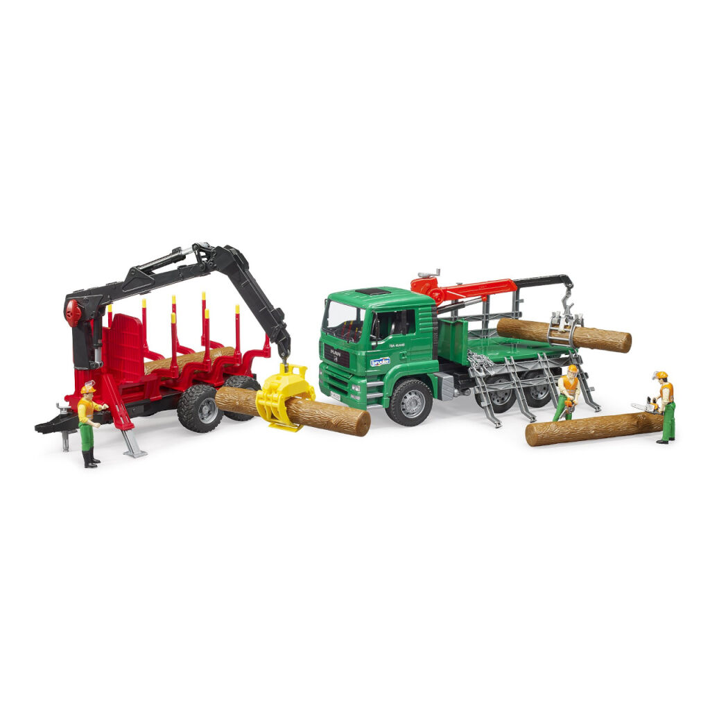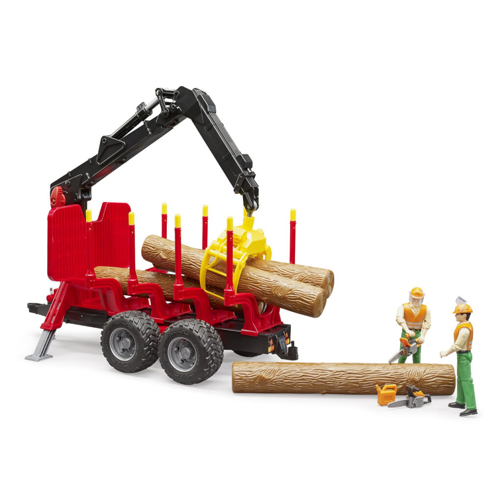 Bruder príves na prepravu dreva s nakladacím ramenom má inštalovaný nakladač s drapákom pre nakladanie Bruder dreva, ktorý je otočný o 360 °, posuvné klanice, výkyvné nápravy pre kopírovanie terénu, najmä pre prácu v lese. Na konci prívesu je ďalší závesné zariadenie pre pripojenie ďalšej vlečky. Súčasťou prívesu sú 4 kusy klád, možno pripojiť za všetky traktory BRUDER. Vyrobené v Nemecku, z kvalitných materiálov.