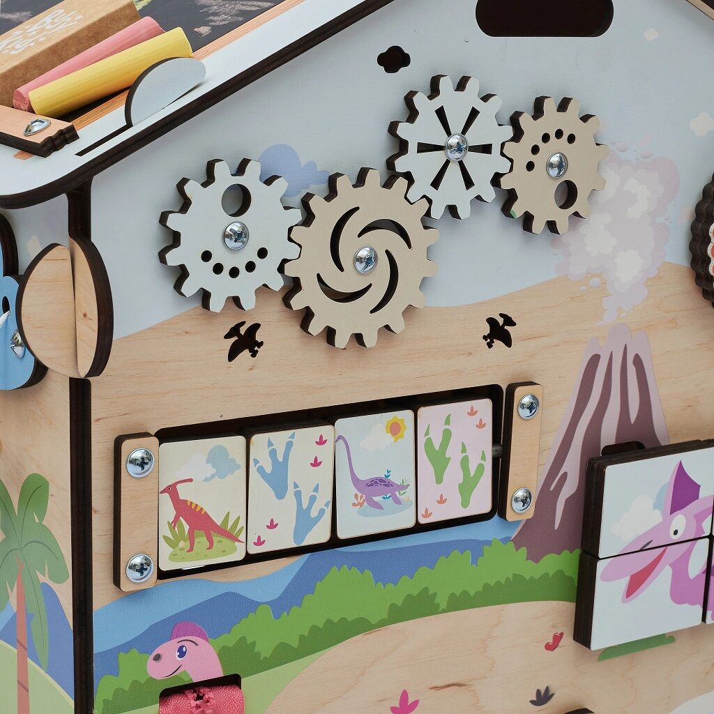Activity board domček ponúka šesť samostatných aktivít, ktoré je možné používať jednotlivo alebo dohromady. Niektoré prvky je možné rozsvietiť, napríklad sopku a slnko, čím vzniká podmanivá herná atmosféra. Domček zahŕňa približne 30 herných prvkov a je možné ho využiť ako úkryt, domček pre bábiky či garáž pre autíčka. Na streche nájdete tabuľu a vkladacie puzzle s dinosaurami. Vďaka interaktívnym prvkom domček podporuje rozvoj kreativity, zmyslového vnímania, logického myslenia a jemnej motoriky. Deti si trénujú koordináciu oko-ruka, sústredenie a trpezlivosť pri zložitejších aktivitách.