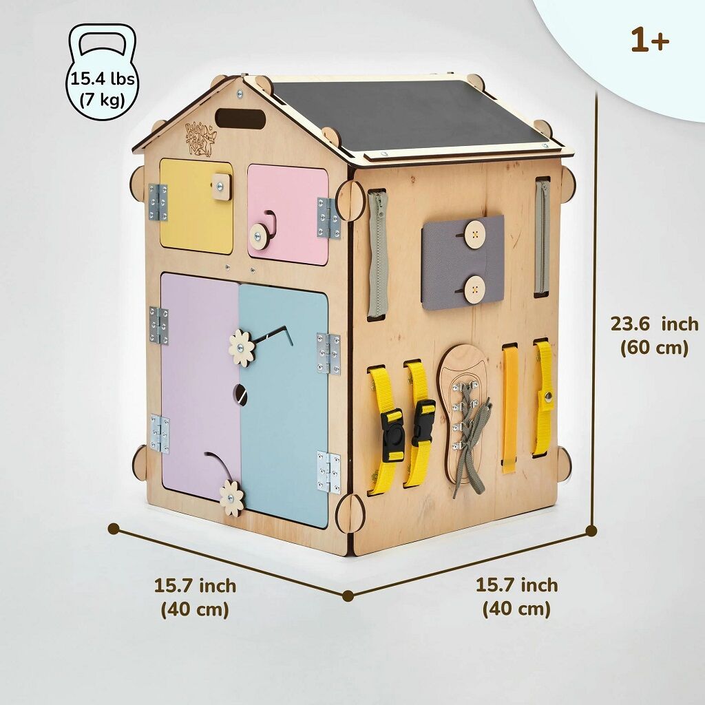 Hrací domček ponúka širokú škálu aktivít. Na streche nájdete tabuľu a vkladacie puzzle, na stenách sú zipsy, suchý zips, dotyková lampa, budík, motorické prvky, tlačidlá, okná a dvere. Otváranie, zatváranie a vhadzovanie hračiek dovnútra aj von deti nesmierne bavia. Vďaka interaktívnym prvkom domček podporuje rozvoj kreativity, zmyslového vnímania, logického myslenia a jemnej motoriky. Deti si trénujú koordináciu oko-ruka, sústredenie a trpezlivosť pri zložitejších aktivitách, ako je zapínanie gombíkov a tlačidiel.