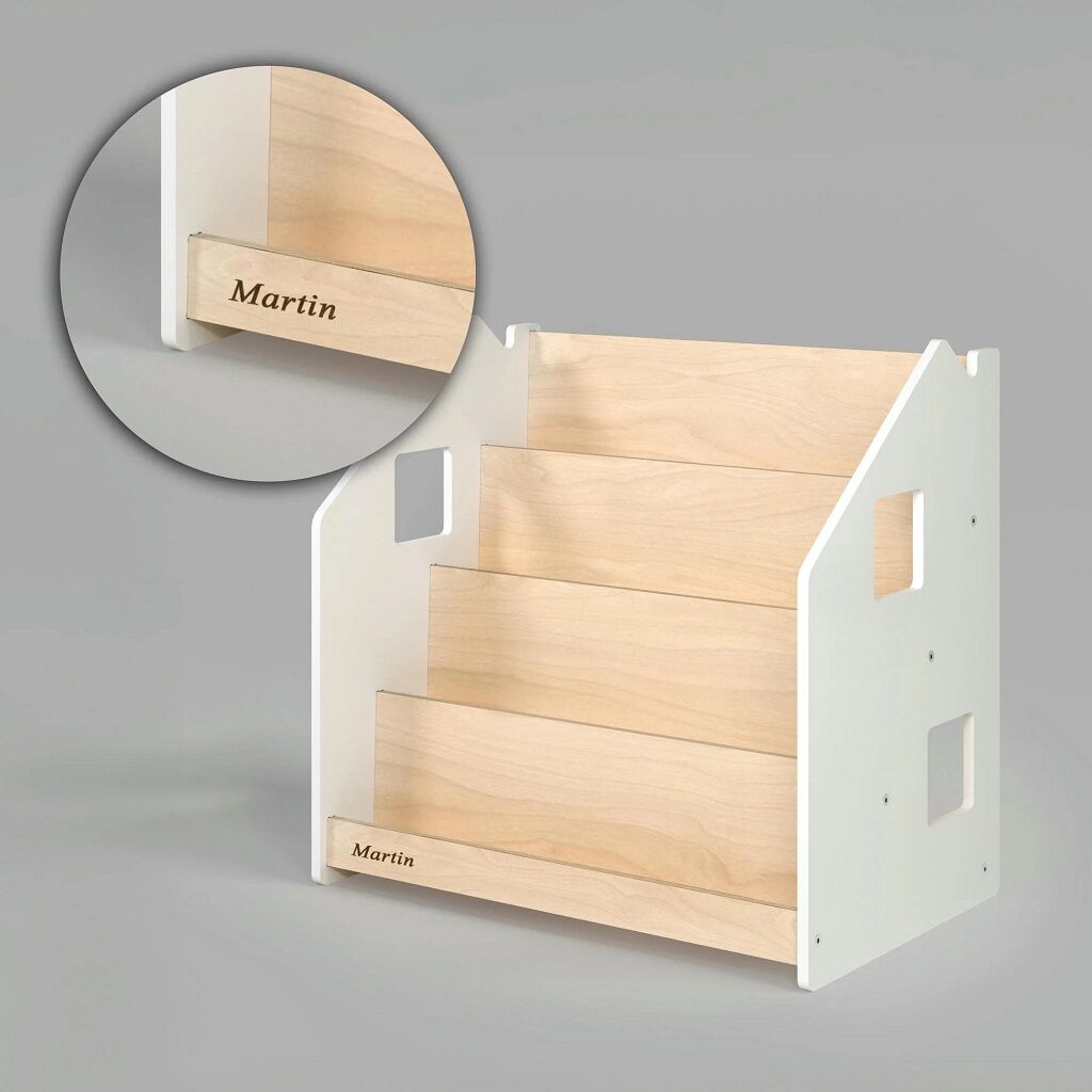 Tento stojan na knihy je navrhnutý tak, aby podporoval detskú samostatnosť a rozvíjal ich záujem o čítanie. Vďaka tomu, že sú knižky vidieť obálkami dopredu, deti si ľahko vyberú tú, ktorá ich zaujme a po prečítaní ju zase jednoducho vráti na miesto. Police ponúka štyri priestranné regály a zadný úložný priestor vhodný pre knihy či hračky. Robustná a bezpečná konštrukcia so starostlivo zaoblenými hranami je ošetrená lakom na vodnej báze. Vďaka jednoduchému, čistému designu krásne zapadne do každého interiéru.