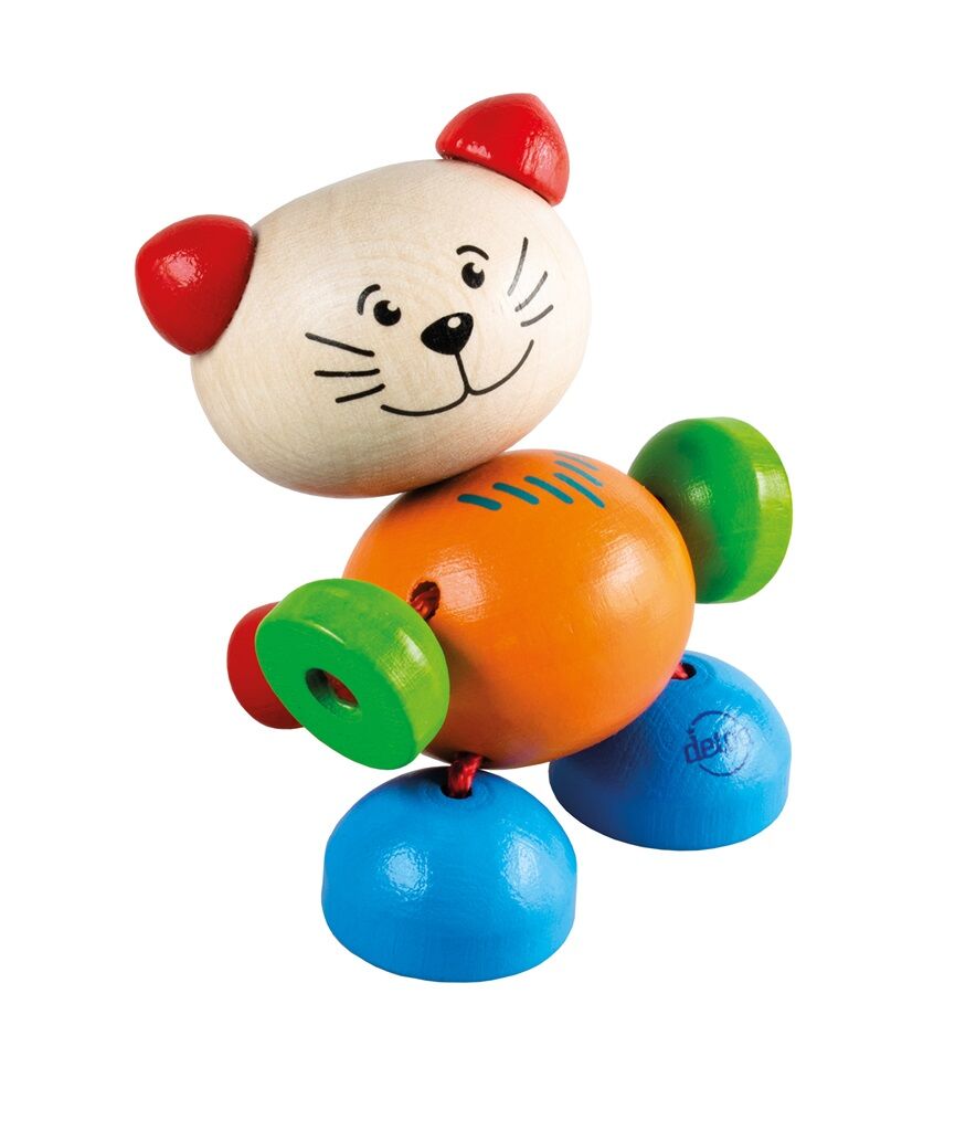 Hračka z farebných drevených tvarov navlečených na gume, ktoré sa pohybujú, točia a ohýbajú. Dĺžka mačičky je 8 cm a je pripevnená na papierovej karte. Vhodná na precvičovanie jemnej motoriky rúk Vašich detí už od 8 mesiacov.
