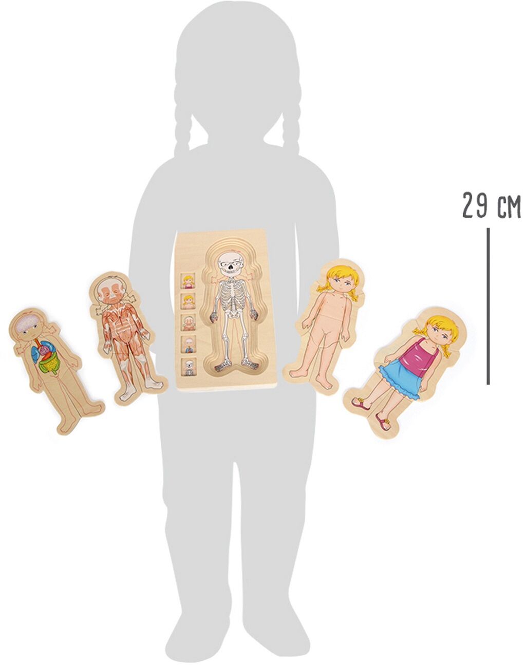 Deti si môžu precvičiť viac ako len motoriku, rozpoznávanie tvarov a farieb. V 4 vrstvách spoznajú ľudské telo, od skeletu až po oblečené dieťa. Päť malých obrázkov deťom pomôže vytvoriť 4 obrázky, každý zo 7 dielikov. Edukatívna zábava z kvalitnej preglejky s jemnými farebnými detailmi.
