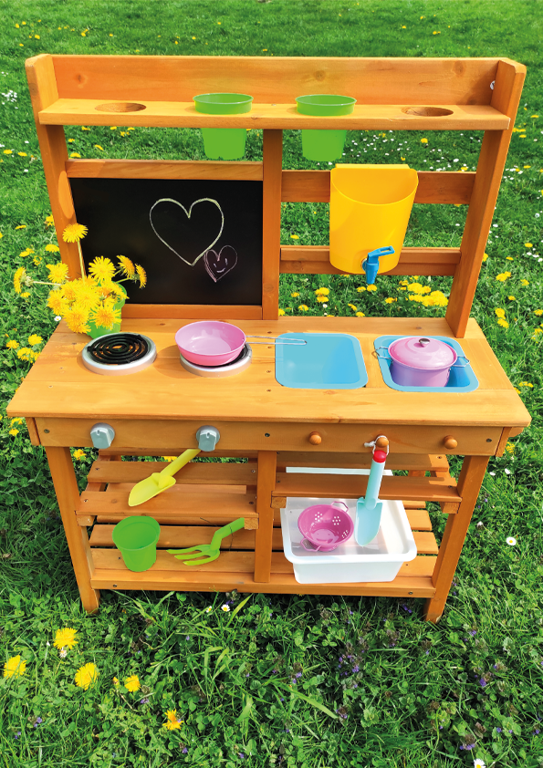 Ponúknite si desiatu priamo pod obzormi prírody! Na mieste, kde pokrmy vonia po sviežom vánku a slnko opeká bochníky z piesku a vody. Táto záhradná kuchynka ponúka skvelú možnosť ako u detí rozvíjať kreativitu, samostatnosť a usilovať svoje kulinárske schopnosti priamo na čerstvom vzduchu. Disponuje užitočnými prvkami ako napr. kohútik, varič, kuchynské náčinie (v podobe lopatky a malých hrablí) či vedierka. Rozsiahle úložné priestory prídu určite aj vhod. Aké je teda dnešné menu? Čistá fantázia!