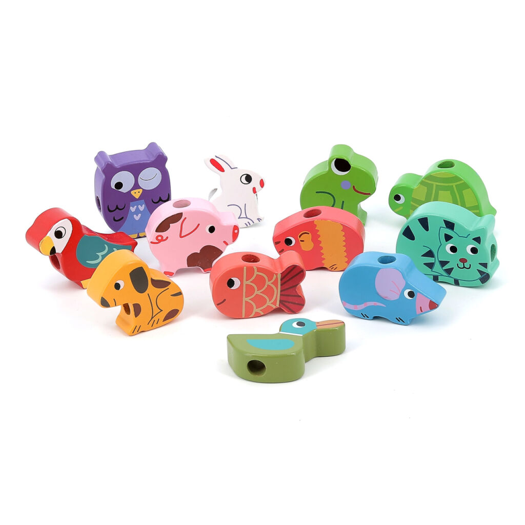 Krásna prevliekačka s motívmi zvieratiek. V kompaktnom balení nájdete 12 ilustrovaných drevených korálkov (napr. mačka, myš, králik, žaba), ktoré deti môžu navliekať na textilnú šnúrku. Hračka pomáha s rozvojom jemnej motoriky. Vybavené bezpečnostnými sponami. Vhodné od 18 mesiacov.
