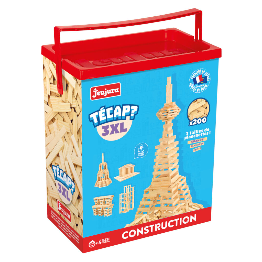Stavebnice Jeujura Técap? 3XL ponúkajú široký priestor pre realizáciu stavieb úplne voľne podľa fantázie detí. Stavebnice sa skladajú z prírodných drevených špalíkov troch rozmerov, čím do stavieb vnášajú variabilitu a dodávajú im na zložitosti. Stavbou môžu deti rozvíjať vynaliezavosť a jemnú motoriku. Sú vyrábané vo Francúzsku, z masívneho bukového a borovicového dreva francúzskeho pôvodu. Dieliky sú ošetrené výhradne za použitia lakov na báze vody. Každá sada je balená v praktickom lepenkovom vedierku potlačenom rastlinnými atramenty a súčasťou balenia sú brožúry so vzorovými stavbami a ich detailmi.