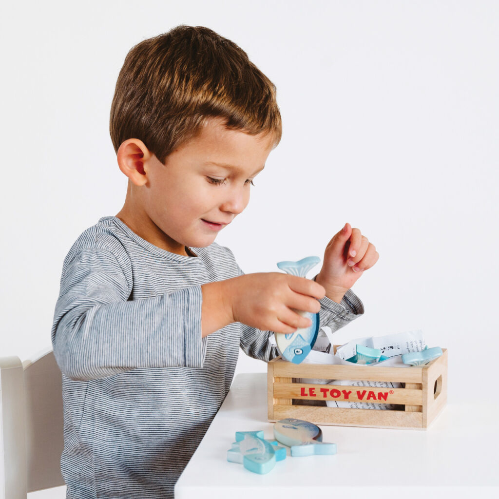 Debnička s rybami je perfektná pre hru na role. Nájdete v nej niekoľko druhov rýb. Deti sa vďaka hračke naučia o rozdielnych potravinách a dôležitosti vyváženej stravy. Vyrobené z pevného a udržateľného dreva, maľované netoxickými farbami, veľkosť tak akurát pre malé detské ruky. Hračka pomôže pri rozvoji koordinácie a jemnej motoriky. Ideálny doplnok detských predajných stánkov a kuchyniek.