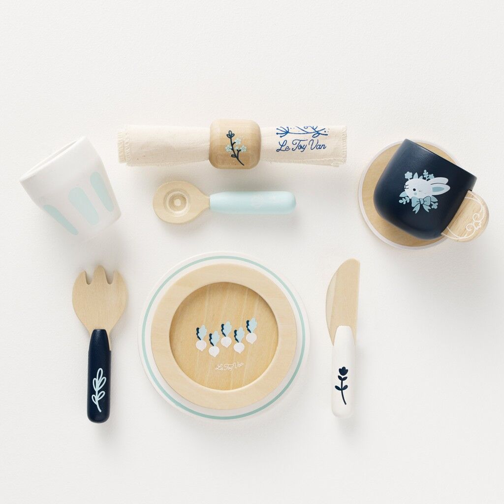 Obed chutí lepšie, keď je servírovaný na peknom riade. Táto hračka je udržateľná a vydrží vám naozaj dlho. Prírodná farba dreva, biela a odtiene modrej k sebe pekne ladia, nechýbajú ani ilustrácie rastliniek. V sade nájdete hrnček, podšálku, téglik, 2 taniere, nôž, vidličku, lyžicu a obrúsok s dekoratívnym krúžkom. Deti si pri predstavivej hre precvičia jemnú motoriku, zručnosť a koordináciu ruka-oko. Maľované netoxickými farbami na báze vody.