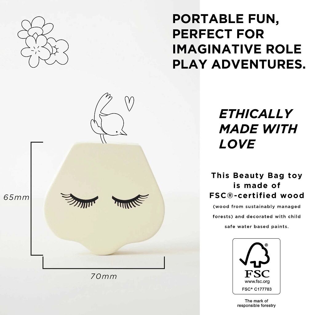 Buďte hviezdami vo vlastnej show! Kozmetickú tašku si zamilujú malé kostymérky a kostyméri, s jej obsahom vytvoria úžasný make-up a účes. Taška je vyrobená z prírodnej bavlny, jej vybavenie je z hladkého a zaobleného dreva, to všetko je ručne maľované netoxickými farbami. Malí vizážisti a vizážistky môžu začať tvoriť svoje dielo. Nechýba krém, očné tiene a aplikátor, púder a labutienka, parfum, rúž, fén, hrebeň, zrkadlo, lak na nechty a štetec, textilné vrecúško. Perfektná hračka pre hru na role je vyrobená z FSC dreva, zdobia ju farby, ktoré sú bezpečné pre deti.