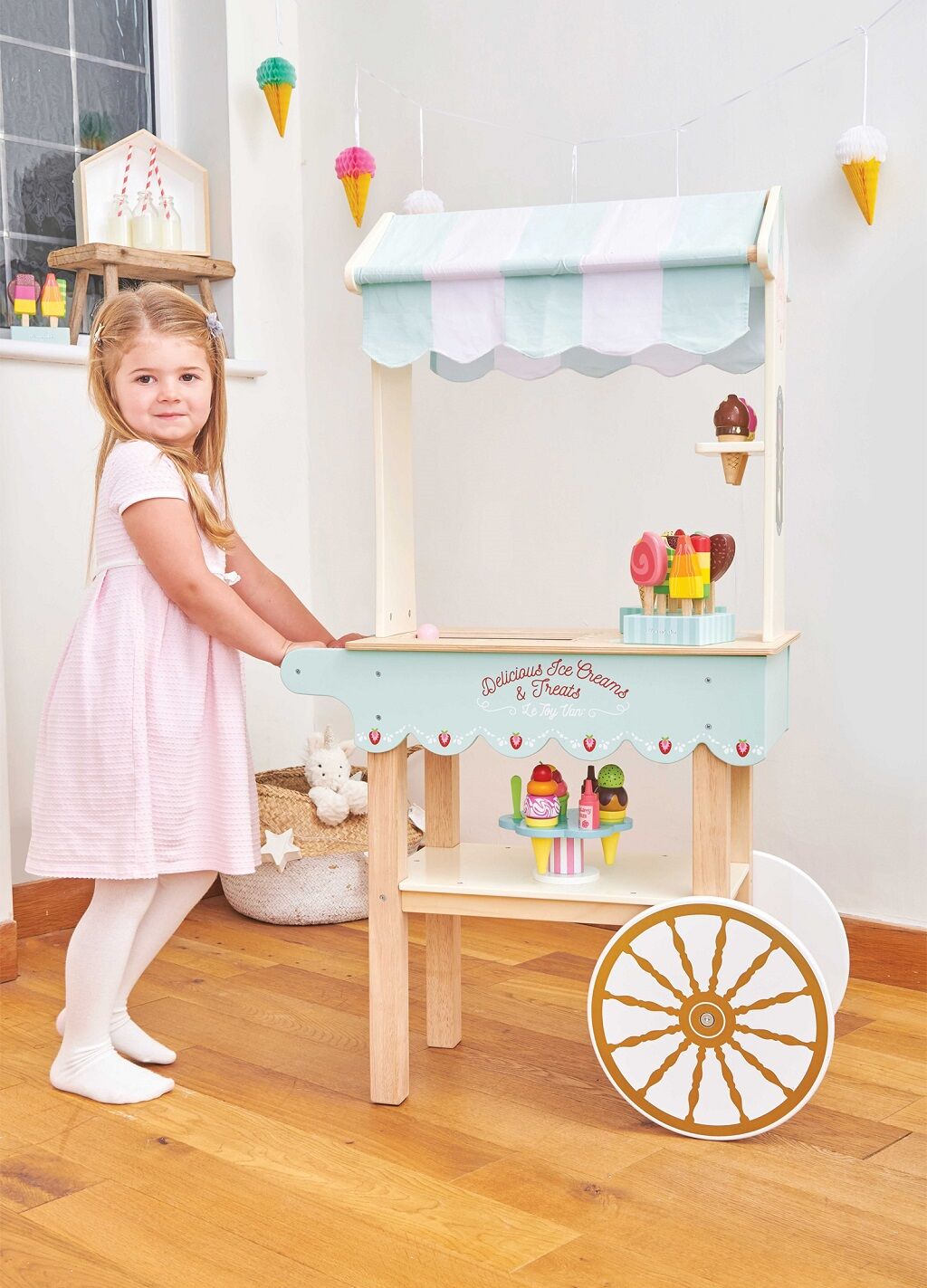 Letné občerstvenie! So štýlovým zmrzlinovým vozíkom, ktorý sa v dnešnej dobe vidí naozaj zriedkakedy, sa deti môžu zahrať na zmrzlinárov a zmrzlinárky. Retro zmrzlinový vozík je perfektný pre predstavivú hru v detskej izbe aj na záhrade. Klasický pruhovaný látkový baldachýn, pastelové farby a zlaté detaily, táto skutočne jedinečná hračka je vyrobená z udržateľného dreva a designovaná tak, aby vydržala mnoho rokov predstavivej hry. Má mnoho realistických funkcií, ktoré môžu deti objavovať počas hry. Priehradku na ľad s posuvnými dverami, ktoré odhalia ilustrácie klasických príchutí zmrzliny, dva magnetické kornúty na zmrzlinu, pohyblivé kolieska, vďaka ktorým budú môcť zmrzlinu servírovať kdekoľvek.