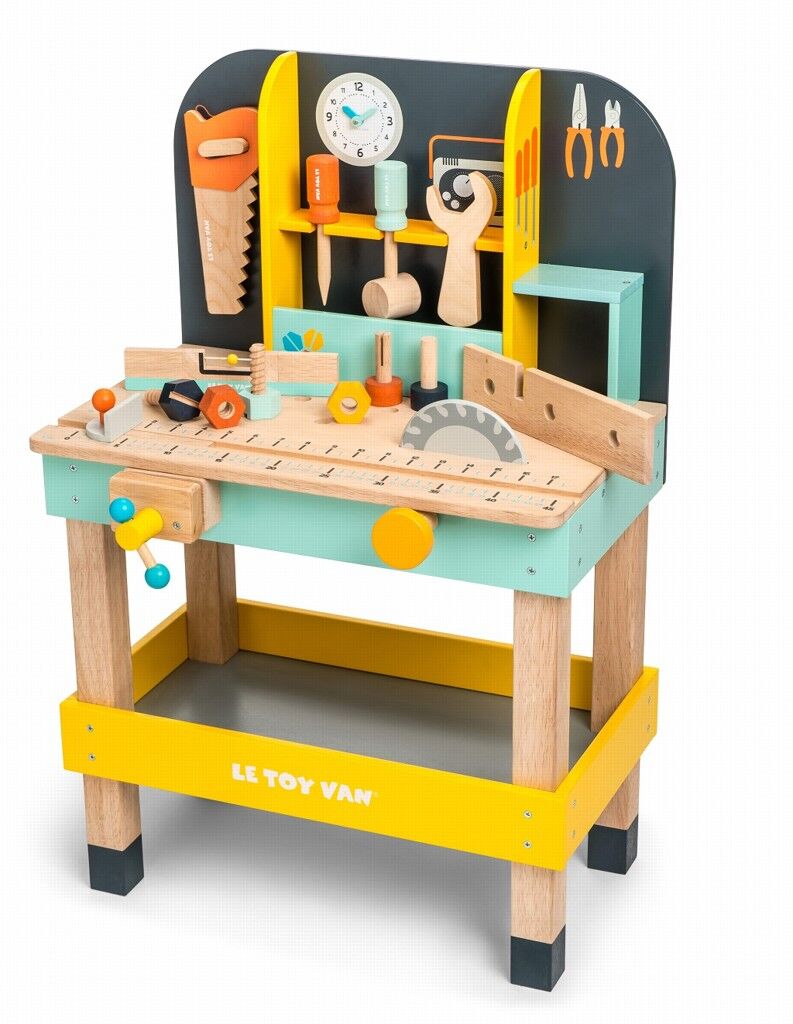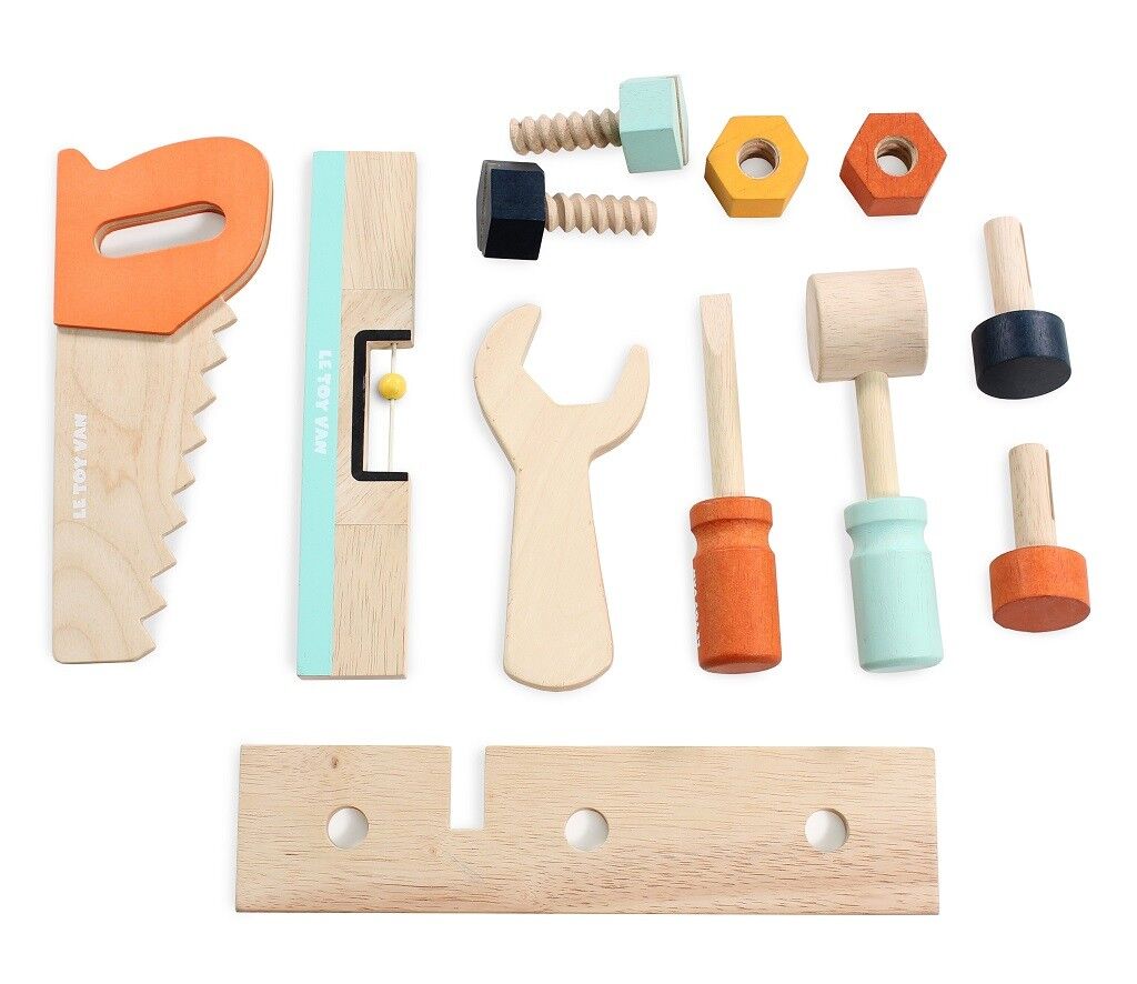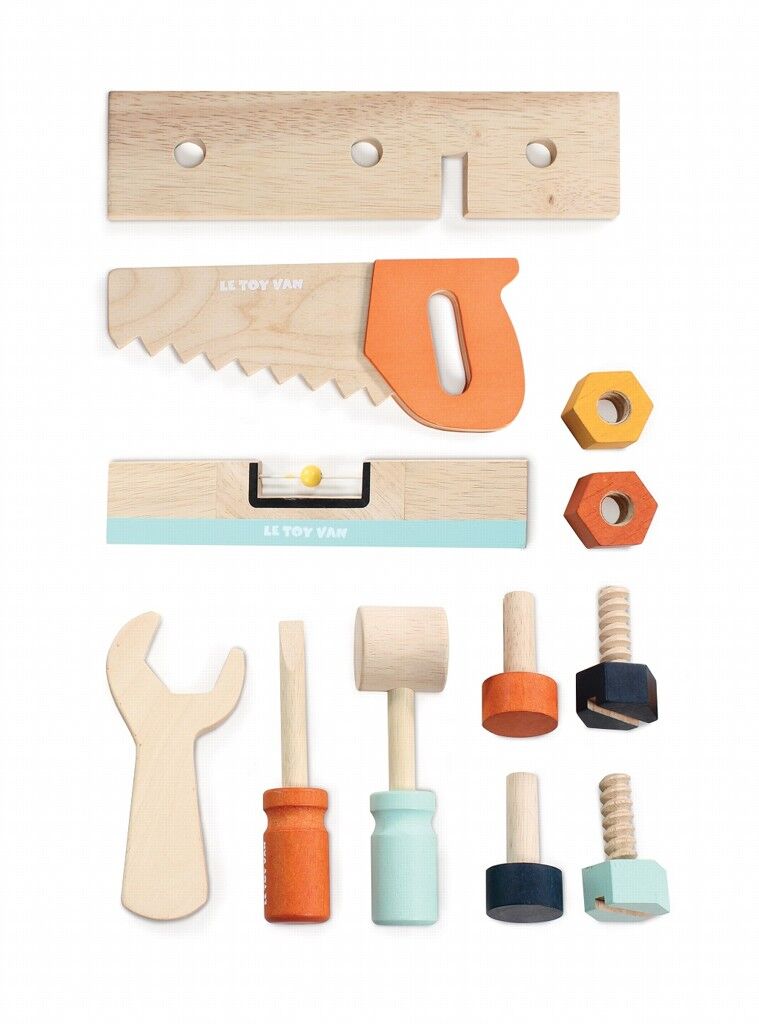 Pripravte sa na eko zábavu s náradím. Robustný ponk vás naozaj prekvapí, je to produkt, ktorý vyhral mnoho ocenení. Táto pestrofarebná hračka je vyrobená z odolného a udržateľného kaučukového dreva, je maľovaná netoxickými farbami na báze vody. V balení nájdete 12 zavalitých drevených doplnkov, ktoré majú veľkosť tak akurát pre detské ruky. Je to pílka, kladivo, skrutkovač, kľúč, vodováha, 2 skrutky, 2 skrutky, 2 klince a drevená doštička.