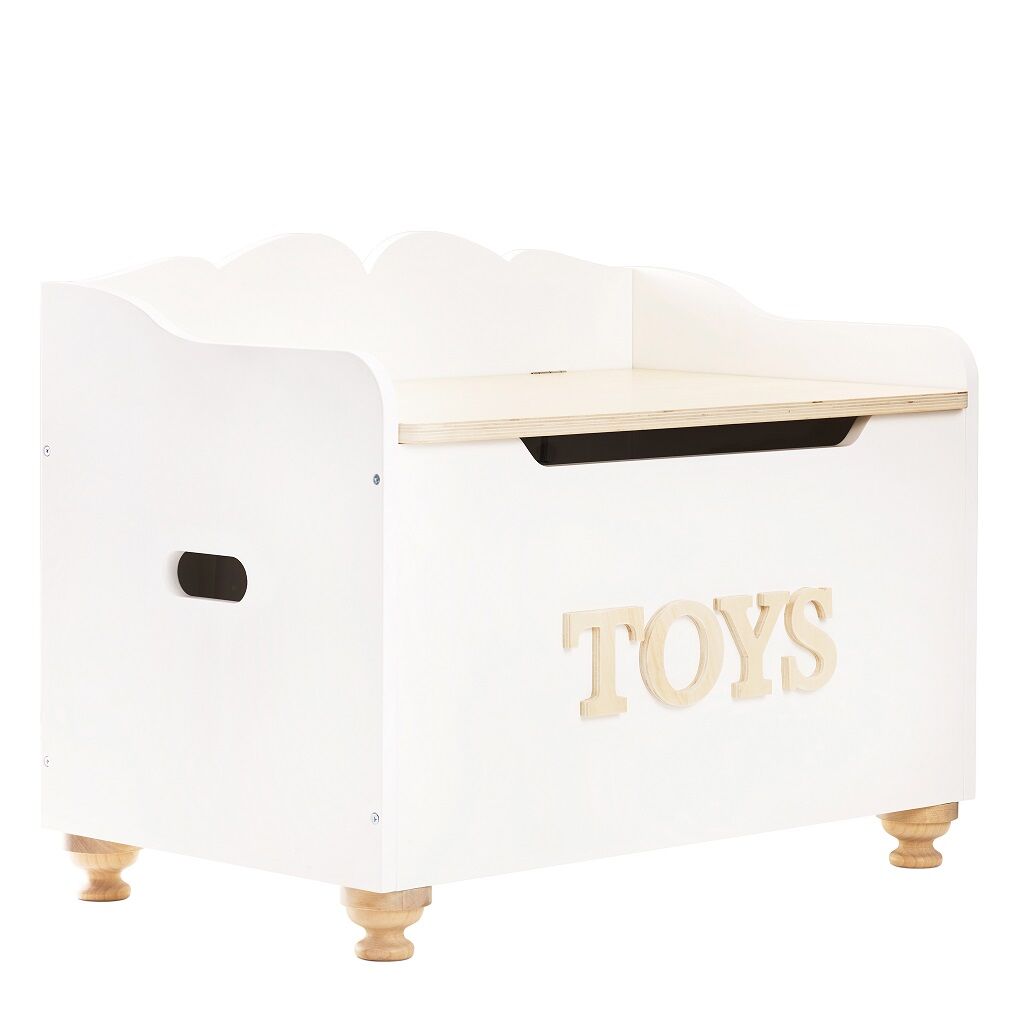 Okúzľujúca a ručne vyrobená drevená truhla na hračky, do ktorej si deti môžu uložiť všetky svoje hračky a poklady. Tento produkt je univerzálny, využijete ho nielen ako elegantný úložný priestor, ale aj ako lavicu na sedenie pre deti! Truhla má pomaly sa zatvárajúce pánty, drevené nohy, reliéfny nápis. Neutrálny design kombinuje klasickú bielu a prírodné drevo. Krásny kus nábytku, ktorý prekoná aj skúšku času. Vyrobené z udržateľného a odolného dreva, vydrží vám skutočne dlho.