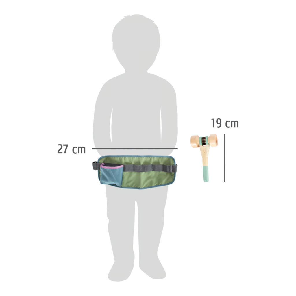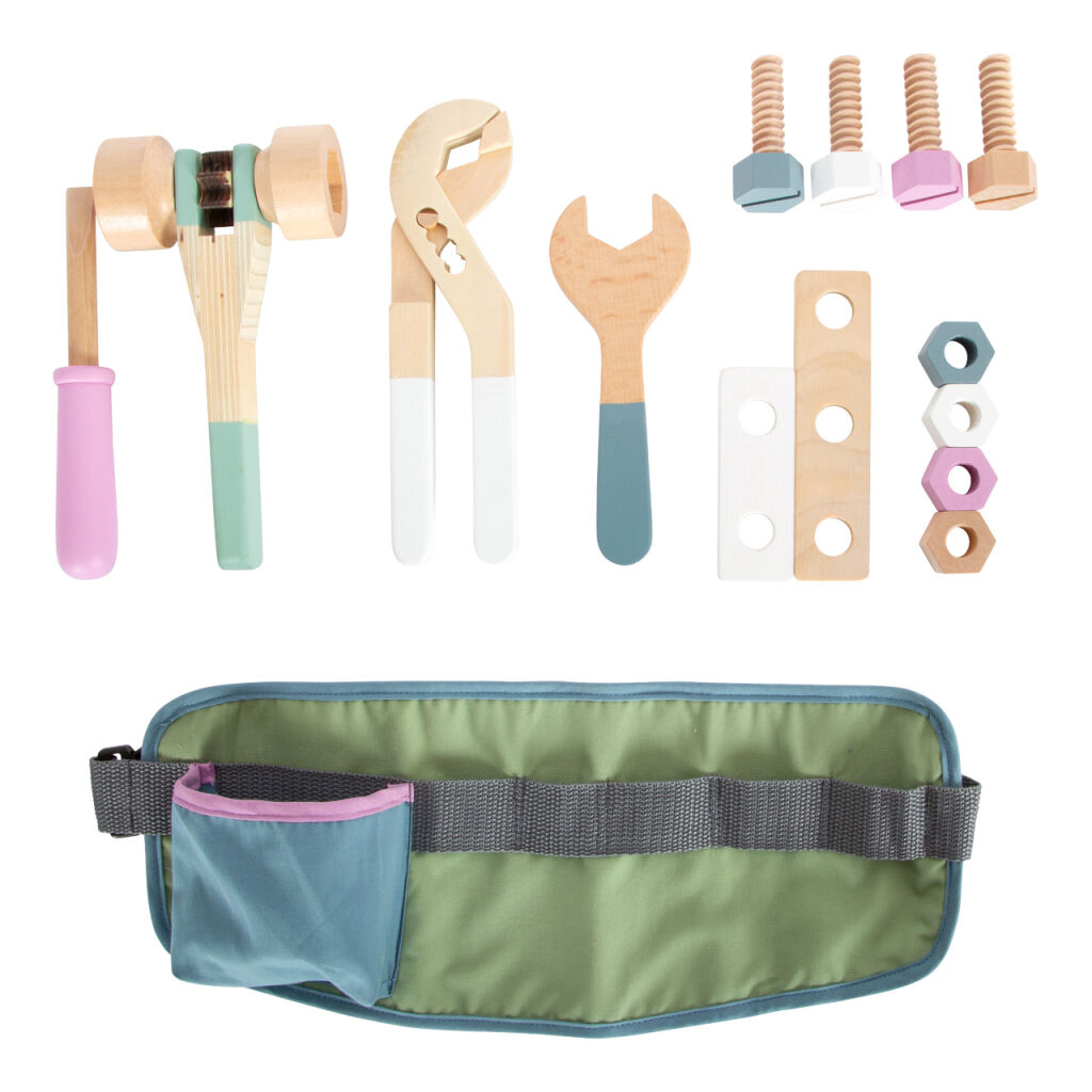 Praktický, nastaviteľný opasok na náradie. S príslušenstvom zloženým z dierovaných kusov, skrutiek a matíc. Nastaviteľný drevený hasák a račňa sú dokonalým doplnkom skrutkovača a kľúča. Slučky rôznych veľkostí ponúkajú priestor pre všetky zahrnuté nástroje. Nenápadné, škandinávske farebné schéma s množstvom viditeľného dreva; rovnako atraktívne pre dievčatá i chlapcov. Pracka sa ľahko otvára a zatvára. Skvele sa hodí k ďalším výrobkom z produktovej rady Nordic.