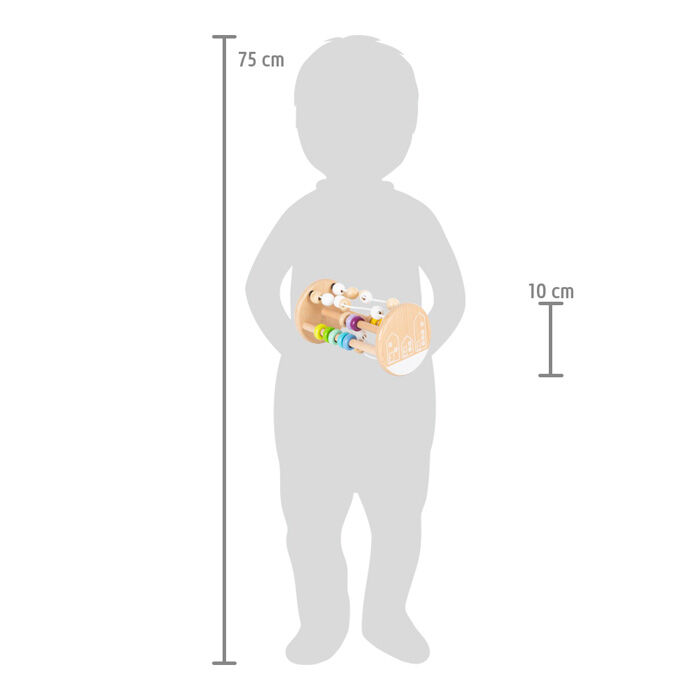 Klasická motorická hračka v dúhových farbách. Drevené korálky sa preháňajú po prepletených dráhach. Pri zatrasení sa navlečené prvky pohybujú do rytmu a vydávajú chrastivé zvuky.