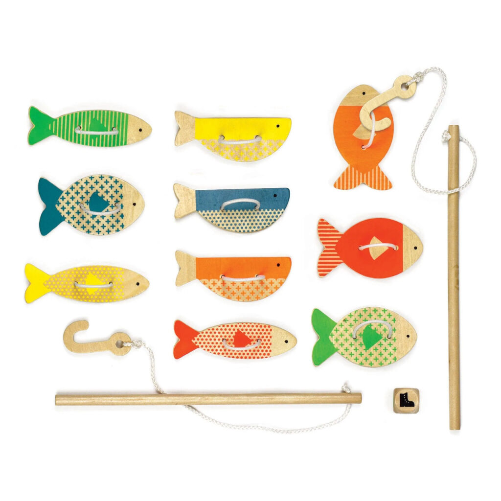 - Obsahuje 10 farebných neónových rýb, 2 drevené rybárske prúty, 1 pestrofarebnú kocku a návod
