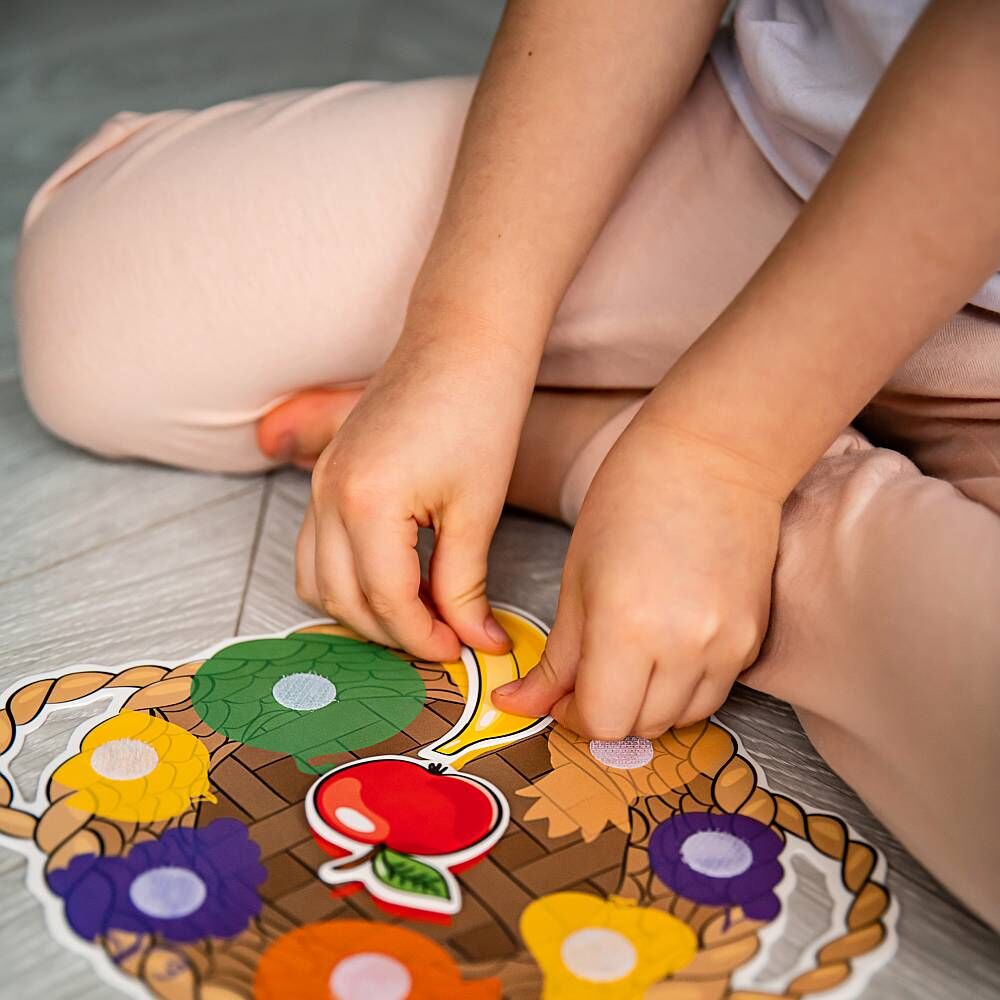 Pri hraní s Velcro trénujete koordináciu ruka-oko, jemnú motoriku, zistíte viac o ovocí, zelenine, ich tvaroch a farbách. Už sa vám zbiehajú sliny? Úlohou deti je roztriediť a správne ukladať na rôzne podožky (tanier, ošatka, doska na krájanie) ovocie a zeleninu podľa ich farieb alebo tvaru. Naučia sa tiež roznať polovice rozrezaného ovocia a zeleniny. Vodítkom pre správne uloženie im bude farebný obrys na krájacej doske.