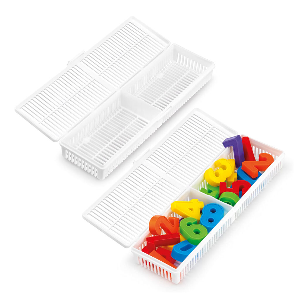 Jednoduchá obojstranná magnetická tabuľka umožňuje deťom písanie alebo kreslenie fixy (nie sú súčasťou balenia) a ukladanie širokej sady dodávaných magnetiek, v ktorej nájdete plastové čísla a symboly základných matematických operácií. Je vybavená dvojicou odnímateľných podpier, pomocou ktorých je možné ju pre väčšie pohodlie uložiť do naklonenej polohy. Tabuľka sa navyše dodáva s dvojicou puzdier, ktoré slúžia na uskladnenie sady magnetiek, alebo aj písacích potrieb. Vyrobené z kvalitného plastu, ktorý je pevný, odolný a zároveň nezávadný.