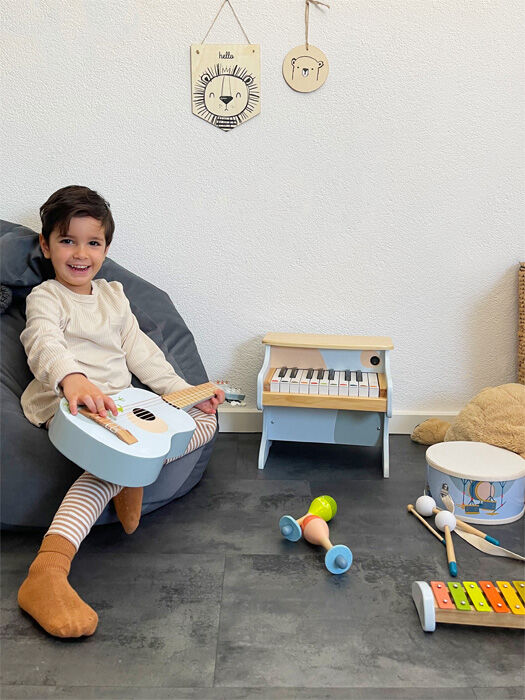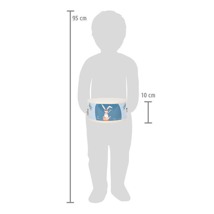 Všetci mladí, nádejní bubeníci budú s touto detskou bubnovou súpravou dobre vybavení, pretože spolu s obľúbeným zajacom má čo ponúknuť aj ušiam poslucháčov! Bavlnený opasok bubna sa dá pomocou kovovej pracky nastaviť na ľubovoľnú dĺžku. Palice sú vybavené krytmi tlmiacimi zvuk, aby v detskej izbe neboli príliš hlučné. Kombinácia prírodného dreva a moderných kontrastných farieb z nej robí absolútny hit pre mladých hudobníkov! Tento detský bubon hravou formou trénuje zmysel pre rytmus a rytmickosť, ako aj koordináciu ruka-oko. Je ideálny na rané hudobné vzdelávanie!