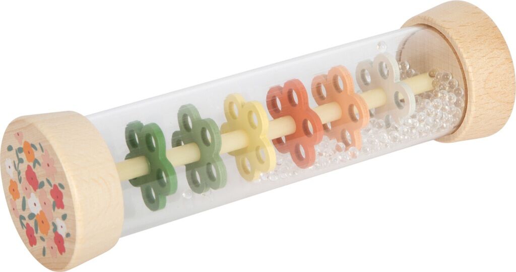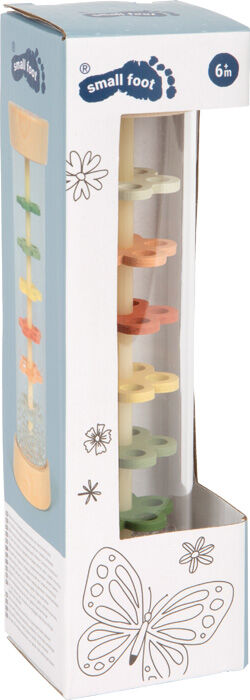Dažďová palička vnesie kúzlo jemných kvapiek dažďa priamo do detskej izby – poteší zrak aj sluch! Jej tiché šumenie a pestrý dizajn vytvárajú jedinečný zmyslový zážitok pre malých objaviteľov. Vnútri priehľadnej trubice sa pomaly sypú trblietavé korálky cez farebné kvetinové doštičky a vytvárajú zvuk pripomínajúci upokojujúci dážď. Deti s nadšením sledujú tento kúzelný pohyb, ktorý rozvíja ich zrakové vnímanie, pozornosť aj schopnosť sústredenia.