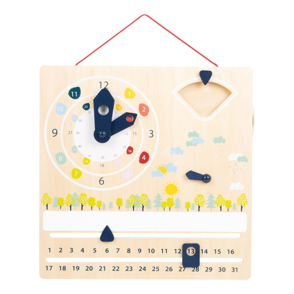 Podporujú deti v učení sa času v 12 a 24 hodinovom systéme. Súčasne sprostredkovávajú znalosti o počasí, dňoch v týždni, mesiacoch a ročných obdobiach hravým spôsobom pomocou jednoduchých ilustrácií. Pri nastavovaní ručičiek sú súčasne trénované motorické schopnosti. So závesným zariadením a nálepkami, na použitie v 15 európskych jazykoch: SK, DE, DK, EN, ES, FI, FR, GR, IT, NL, NO, PL, PT, RU, SE.