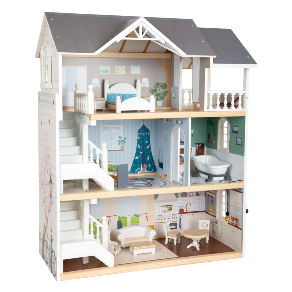 Veľký, stabilný drevený domček pre bábiky zaujme svojim detailným designom ako vo vnútri, tak zvonku. Vďaka otvorenej prednej strane je ideálny pre spoločnú hru viacerých detí, ktoré sa môžu ľahko hrať zároveň.