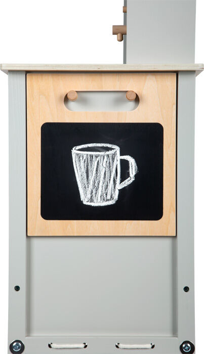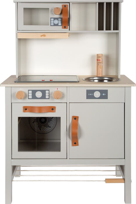 Moderná detská kuchynka s robustnou konštrukciou v trendy šedej farbe v kombinácii so štýlovými koženými madlami v koňakovej farbe. Okamžite pripravená na hranie s priloženým hrncom s pokrievkou, panvicou a kovovým kuchynským náradím. Dodáva sa s kovovým drezom a otočnými gombíkmi, ktoré vydávajú zvuk. Súčasťou je elektronická varná doska so svetlom a zvukom a zaťahovacím digestorom so svetelným symbolom. Vyberateľný pekáč je možné použiť aj ako tabuľu na kreslenie. Povrchy v chladničke a rúre sú potlačené kuchynskými detailmi pre väčšiu zábavu pri hraní. Obojstranný zadný panel s vysoko kvalitnou potlačou vo vzhľade dlaždíc alebo jednoduchej šedej farbe. Je možné perfektne doplniť ďalšími výrobkami a kuchynskými spotrebičmi z kolekcie Tasty.