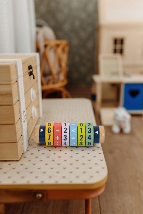 Táto motorizovaná drevená kalkulačka ponúka širokú škálu matematických možností a podnecuje deti k premýšľaniu a riešeniu matematických problémov. Drevený motorizovaný počítací valec so šiestimi rotujúcimi dielikmi umožňuje malým matematikom sčítať, odčítať, násobiť a deliť až do čísla 99. Otáčanie dielikov vytvára matematické rovnice, ktoré je potrebné vyriešiť. Kompaktný dizajn umožňuje vziať túto kalkulačku kamkoľvek so sebou - skvelý nápad!