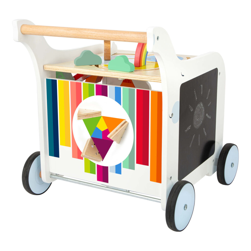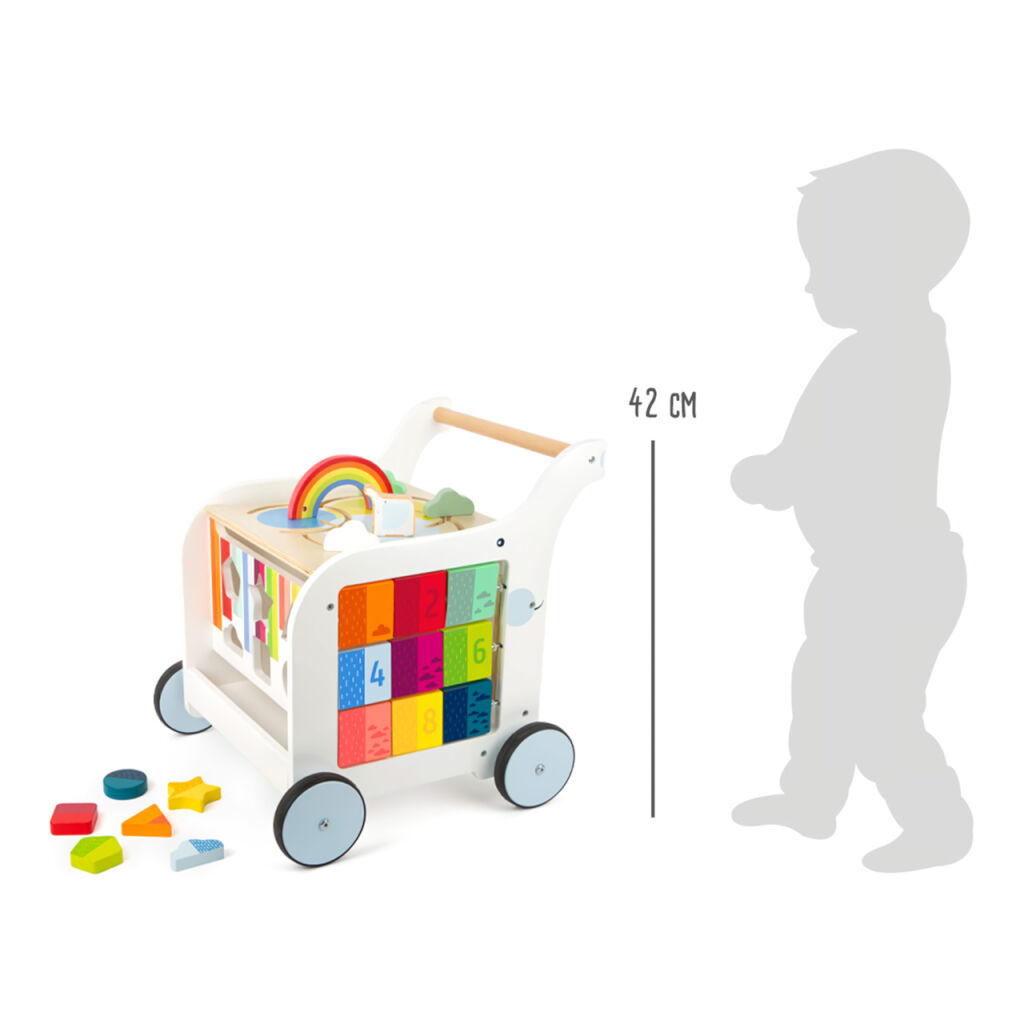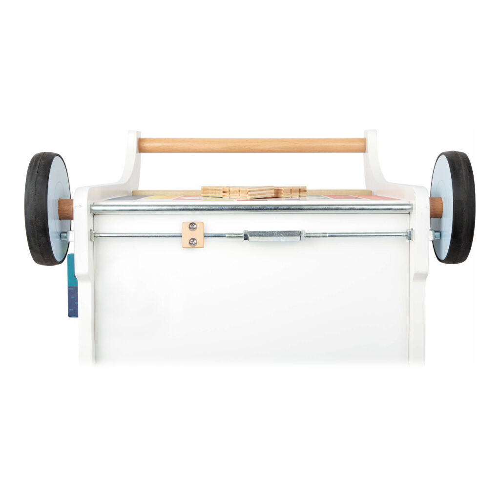 Chodítko v tvare slona je multifunkčným doplnkom pre hru aj výučbu, prináša zábavu na všetkých svojich piatich stranách! Deti sa môžu zabaviť dúhovým labyrintom, vkladačkou s rôznymi tvarmi, kreslením na tabuľku, alebo otáčaním a odklápaním rôznofarebných prvkov. Vrchnú dosku s labyrintom je možné odklápať, je vybavená výrezmi brániacimi priškripnutiu detských prstov. Odklopením odhalíte objemný úložný priestor na hračky, alebo obľúbeného plyšáka. Kolesá vozítka sú opatrené pogumovaním, ktoré zaisťuje kultivovaný, tichý chod na všetkých typoch povrchov. Sú tiež vybavené brzdou, ktorou môžete nastaviť rýchlosť a oporu podľa veku a pohybových schopností Vašich detí. Výrobok vyžaduje montáž, dodávané s obrázkovým návodom na zostavenie.
