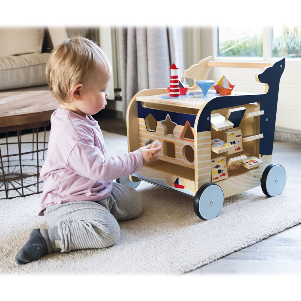 Poďme na prieskum s veľrybou! Toto drevené chodítko v tvare veľryby pomôže deťom s prvými krôčikmi a zároveň ponúka hračky na rozvoj motoriky. Chodítko sleduje štýl morského sveta a jeho živočíchov. Na štyroch stranách chodítka nájdete hry ako je vkladanie tvarov, otáčanie obrázkov alebo kresliaca tabuľka. Deti sa môžu naučiť počítať, určovať svetové strany alebo rozlišovať ročné obdobia. Chodítko má pogumované kolieska, takže je tiché a bezpečné. Chodítko sa otvára hore a dvere sú uzamknuté prstom. Môžete do nej preto uložiť všetky bloky. Nájdete tu aj brzdový systém, ktorý zabraňuje nehodám.