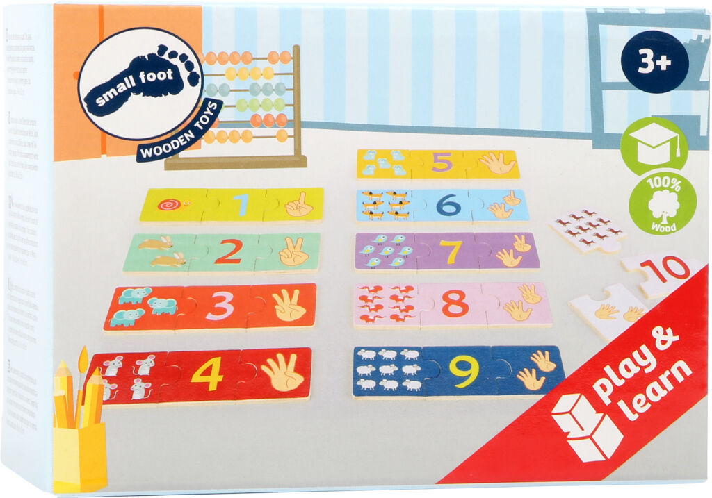 Poď, učíme sa počítať! Toto drevené výukové puzzle pomáha malým deťom objavovať svet čísel a precvičovať si počítanie. Sady troch kusov je potrebné zložiť dohromady. Puzzle je možné použiť aj ako pexeso. Maľované drevené dieliky zobrazujú čísla 1 až 10 v troch variantoch.