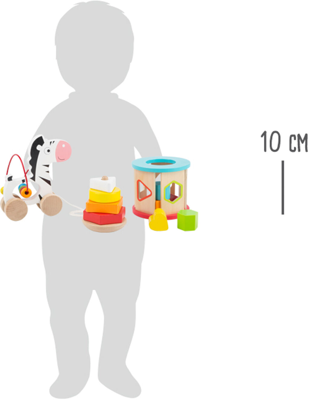 Rozmanitá hracia sada na rozvoj motoriky najmenších poteší pestrými farbami a spracovaním. Ťažná zebra je vybavená šnúrou a integrovanou dráhou na korálky. Hra na stohovanie má vypuklú základňu, a preto udržiava rovnováhu. Základné tvary hniezd môžu byť umiestnené v preglejkovom valci a pri kotúľaní vydávajú hrkajúce zvuky.