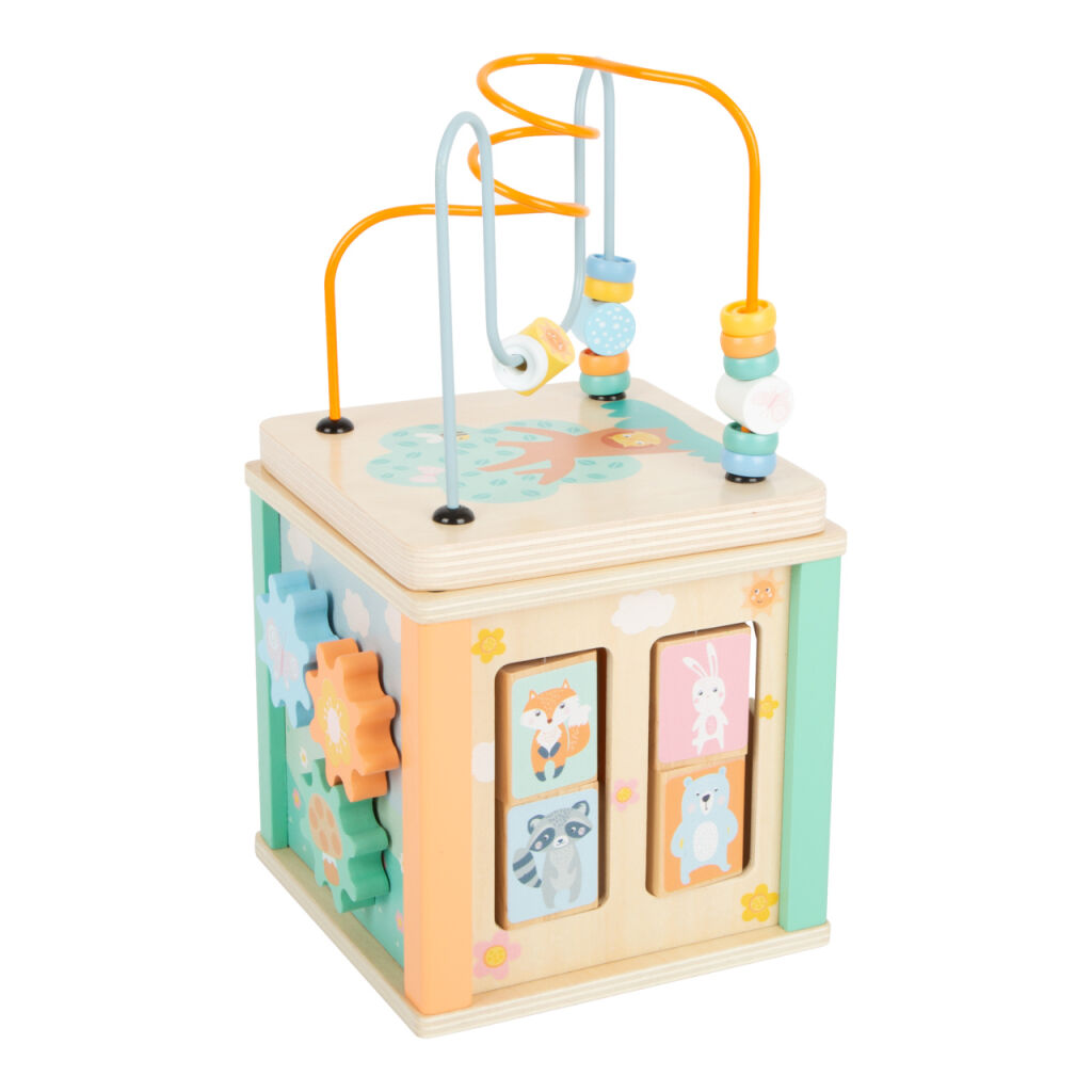 Skladajte, strkajte, klapajte, otáčajte! Môžete sa hrať zo všetkých piatich strán! Drevená motorická kocka ponúkne zábavu aj najmenším deťom. Perličkové bludisko, otáčajúce sa obrázky, otvory s kockami pre vkladanie, ozubené kolieska - všetky tieto prvky deti naučia rozevnávat farby a tvary a tiež precvičia ich jemnú motoriku. Trendy pastelové farby, roztomilé zvieracie motívy, hravé detaily, táto kocka bude pravým pútačom v každej detskej izbičke. Vrchné veko môžete zložiť a uložiť do kocky hore nohami, ušetrí vám tak kúsok miesta. Krásna motorická kocka je súčasťou produktového radu "Pastel" a zaujme vysokým viditeľným podielom dreva a moderným zafarbením v pastelových farbách.