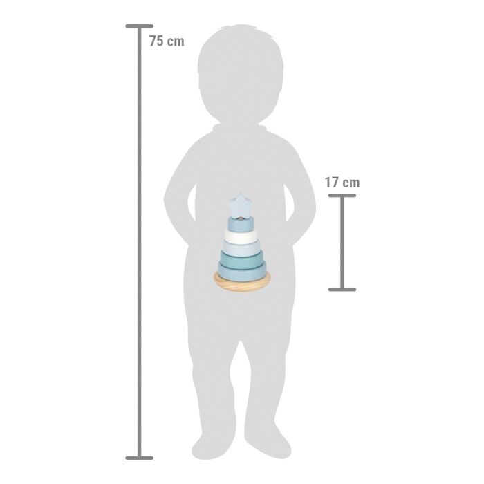 Táto drevená stohovacia veža v jemných pastelových odtieňoch modrej s prírodnými prvkami je zakončená hviezdou, ktorej hračke dodáva osobité kúzlo. Rôzne farebné a veľkostne odstupňované krúžky pomáhajú deťom precvičovať jemnú motoriku, sústredenie aj vnímanie veľkostí. Veža má zaoblenú základňu, vďaka ktorej sa môže ľahko pohupuje – to z nej robí nielen edukatívnu, ale aj zábavnú hračku. Bezpečná, pohyblivá centrálna tyč sa pri zatlačení ohýba, čo zaisťuje väčšiu bezpečnosť pri hre aj ľahšie navliekanie krúžkov.