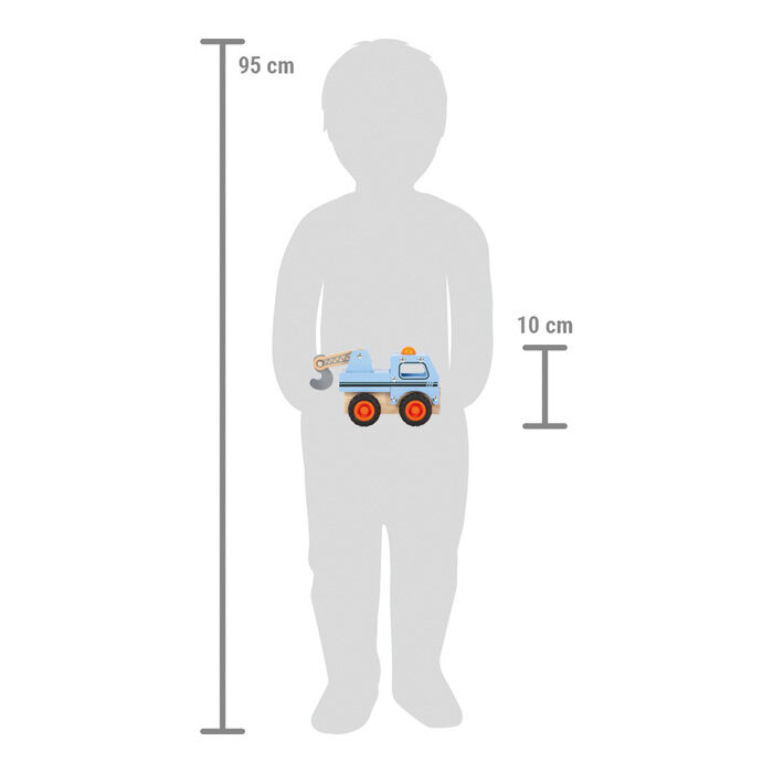 Na robustných pogumovaných kolesách je toto odťahové vozidlo vyrobené z certifikovaného dreva FSC® všade tam, kde je potrebné vykonať odťah pokazeného vozidla. Vďaka pohyblivému nakladaciemu žeriavu s hákom, ktorý funguje ako ťažné zariadenie, je v detskej izbe možná kreatívna a realistická zábava. Vďaka zaobleným hranám a okenným otvorom sa deťom autíčko ľahko uchopuje a pohybuje s ním. Ideálne pre malých milovníkov áut. Detský dizajn s maľovanými detailmi a tvárou dodáva autíčku osobitosť. Kabína vodiča ponúka dostatok miesta aj pre figúrku na hranie, ktorú je možné umiestniť do prednej časti vozidla. Figúrka nie je súčasťou balenia.