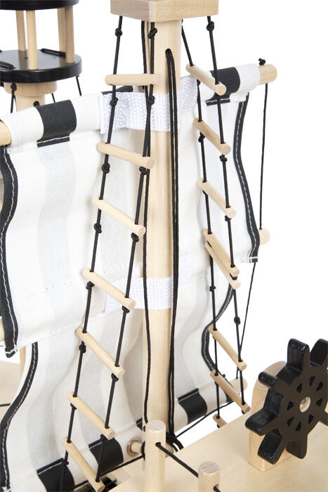 Ahoj piráti! Táto prepracovaná pirátska loď vyrobená z robustného dreva splní prianie vďaka mnohým autentickým detailom. Loď obsahuje aj čln, na ktorom môžu veslovať dvaja pohybliví piráti. Obsahuje tiež žraloka, papagája, truhlu s pokladom, delo, dva sudy, dosku, vlajku. Všetky plachty je možné zdvihnúť a vytiahnuť pomocou lán, rovnako ako na skutočnej lodi. Delo, ktoré vystreľuje svoje tri plstené delové gule vzduchom, pridáva ďalšiu dávku zábavy. Hracia sada s veľkou pirátskou loďou sa ideálne hodí na hru plnú fantázie pre odvážnych bukanierov, ktorí preskúmavajú more, objavujú nové krajiny a vydávajú sa na lov pokladov! Interiér pirátskej lode ponúka množstvo úložného priestoru pre všetky nájdené poklady a tiež truhlu s pokladom na obzvlášť cennú korisť. Pohyblivá kotva pripevnená k lanovému navijaku, povrazové rebríky, žeriav, padacie dvere na palube a poklop na zadnej časti, to všetko poskytuje príležitosť pre realistickú hru. Keď má byť loď odložená priestorovo úsporným spôsobom, je možné zábradlie a sťažne lodi ľahko odstrániť. Vhodné pre figúrky do veľkosti 12 cm.