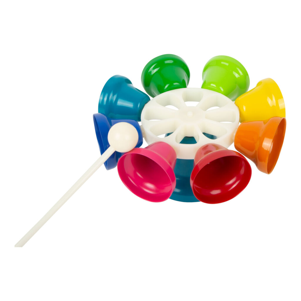 Iná farba, iný zvuk! Tento kolotoč má osem farebných zvončekov, každý z nich je naladený na inú nôtu - C, D, E, F, G, A, H, C. Zvonček môžete držať v ruke alebo ho nechať na stojane. Paličkou môžete hrať podobne ako na xylofón. V balení nájdete aj noty s 8 rôznymi skladbami pre začiatočníkov a malé deti - noty sú zaznačené aj farebne. Hudobný set podporuje u detí rozvoj rytmu, hudobného sluchu a tiež koordinácia ruka-oko. V notách nájdete pesničky ako "Strýček Donald farmu mal", "Rolničky", "trblieta sa, hviezdička". Perfektný tiež do škôlok, prvých stupňov základných škôl.