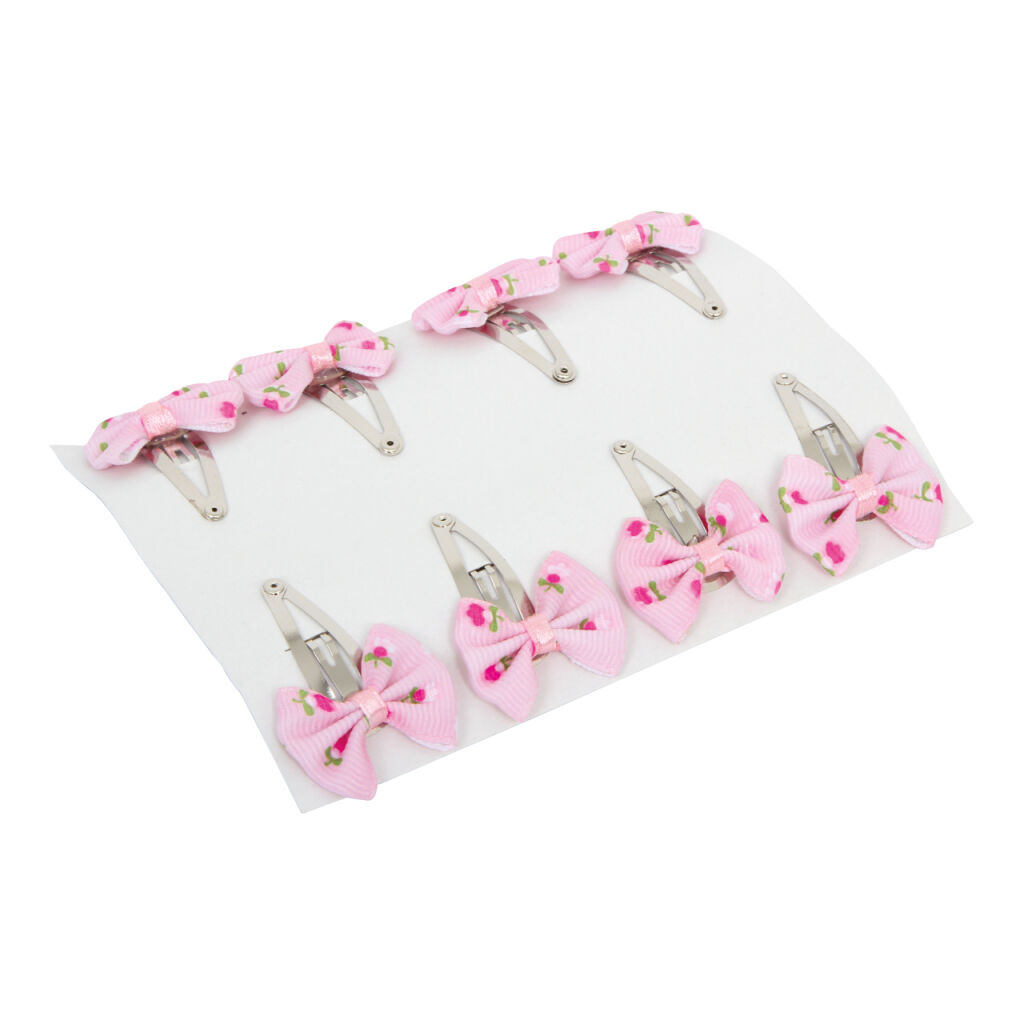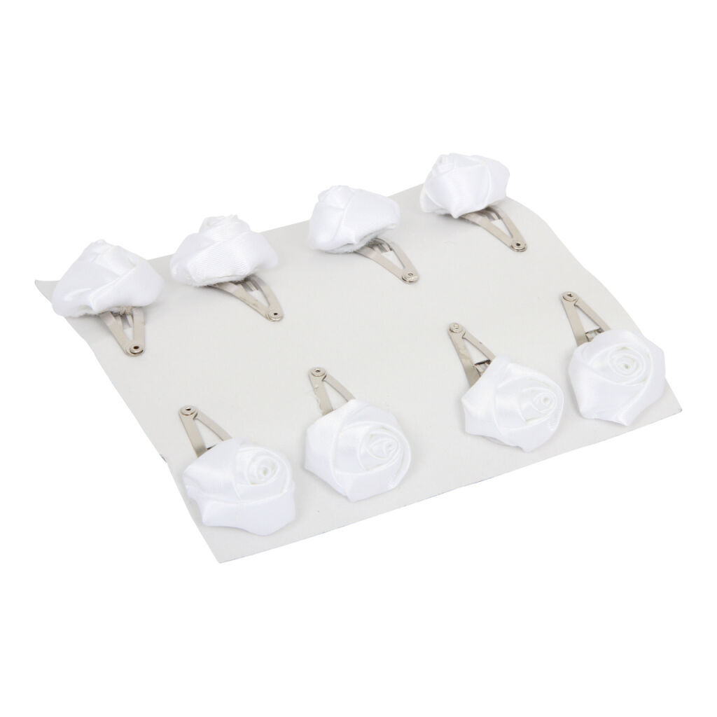 Súprava 32 ks. Kúzelnou ozdobou pre neposedné vlásky sú tieto sponky s motívom kvetov! Strieborné spony držia vlasy pohromade a kvetinky s mašličkami sú pútačom pohľadov malých slečien. Vždy 4 páry rovnakého motívu môžu byť použité aj ako okrasa mašľou na darčekoch alebo doplnok kvetinovej výzdoby.