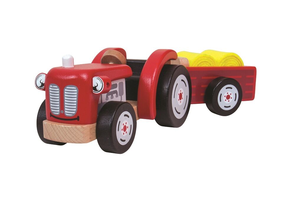 Tento pekný a drevený retro traktor s vlečkou pomôže s prepravou zvierat alebo obilia. Má polohovateľne predné svetlá a príves s otočným závesom. Tiež obsahuje dva balíky sena. Keď deti balíky vyložia ponúkne sa im veľa miesta pre všetky ich zvieratá (niesu súčasťou balenia). Traktor s prívesom má zaoblené kraje, rohy a kolesá a je tak ideálny pre malé ruky. Podporuje detskú kreativitu a predstavivosť. Rozvíja koordináciu ruka-oko a jemnú motoriku. Vyrobené z kvalitných materiálov z zodpovedných zdrojov. Zodpovedá európskej bezpečnostnej norme. Postavička nieje súčasťou balenia, je možné ju dokúpiť v našej ponuke.