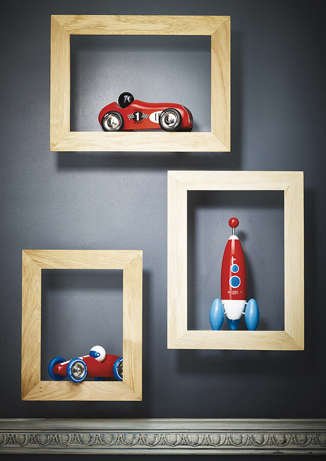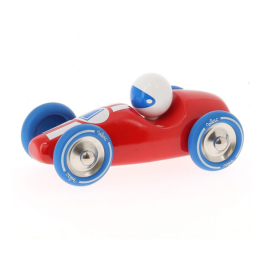 Červené pretekárske auto vyrobené z lakovaného dreva s kovovými pogumovanými kolesami. Je vhodné ako na hranie tak ako dekorácia do izieb detí či dospelých. Vyrobené vo Francúzsku.