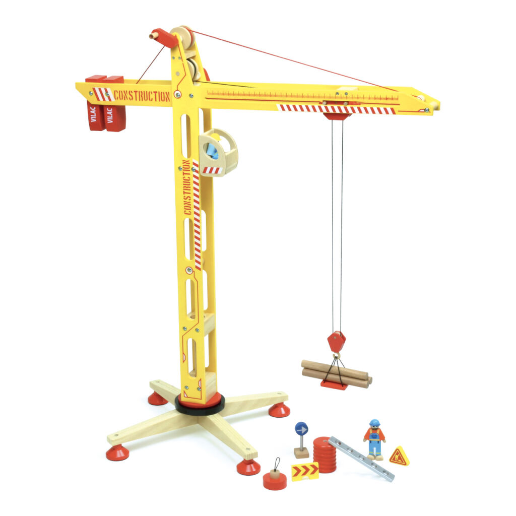 Dajte nový rozmer Vášmu stavenisku a vrhnite sa na stavbu tých najvyšších budov so správnym žeriavom. Svojimi impozantnými rozmermi sa hračka stane neprehliadnuteľnou dominantou detskej izbičky. Množstvom starostlivo stvárnených detailov, kabínou, protizávažiami a mačkou nadchne každého fanúšika stavebnej techniky. Vďaka širokej podstave je stabilná a umožňuje bezpečnú hru. Ponúka široké možnosti manipulácie, celým žeriavom je možné plne otáčať, bremeno je možné posúvať a pohodlne zdvíhať pomocou dvojice kľučiek. Medzi dodávaným príslušenstvom nájdete pohyblivé figúrky žeriavnika a robotníka, plošinu, magnet, rôzne bremená, ale aj značky nevyhnutné na ohraničenie prebiehajúcej práce. Vyrobené z masívneho dreva a odolnej preglejky, ošetrené atraktívnymi nezávadnými farbami.