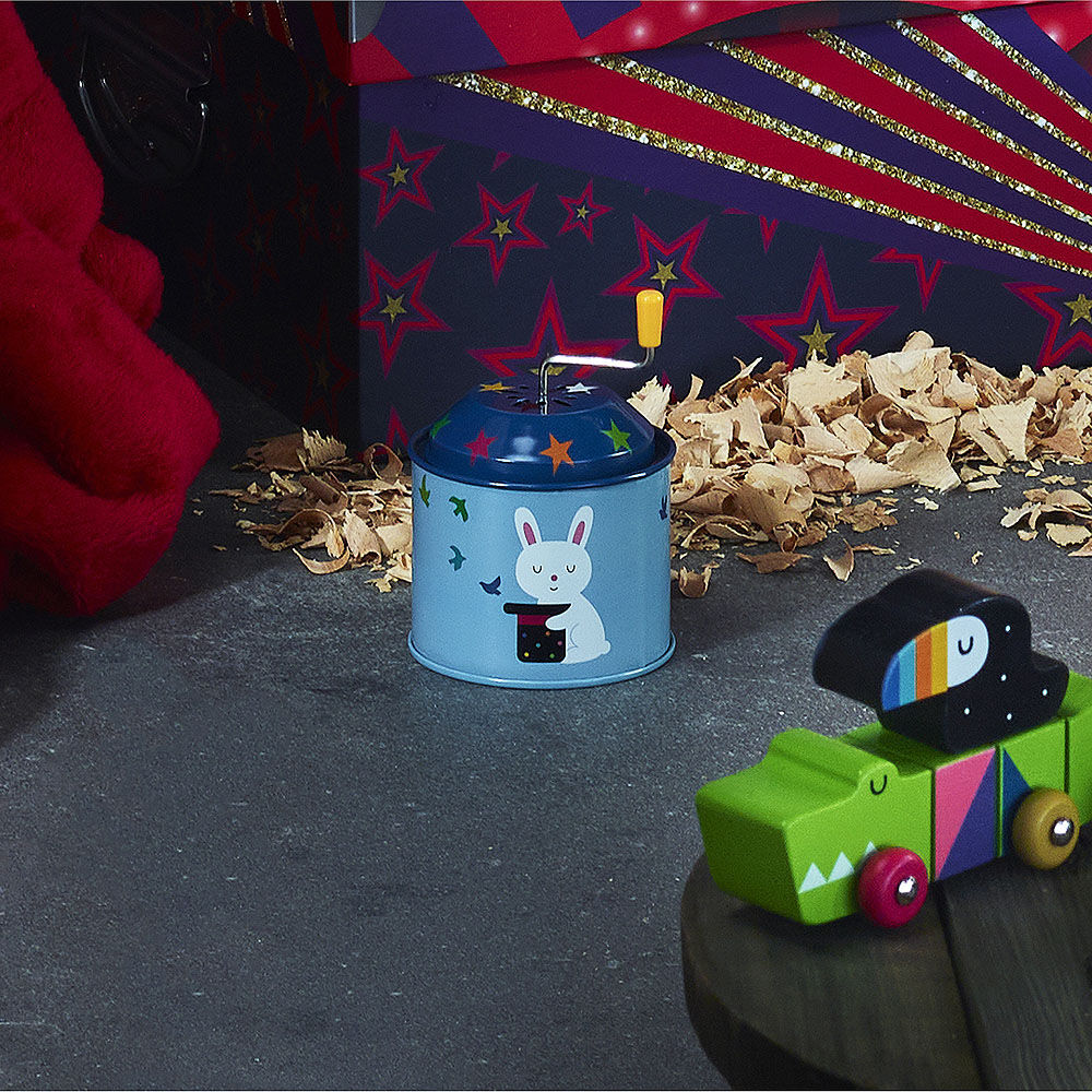 Kovové hracie skrinky - mlynčeky, ktoré hrajú melódiu. Zdobia ich veselí zvierací kúzelníci. Zvieratá, ktoré lietajú s balónikmi, čítajú knihu alebo aj zvierací surferi. Ilustrované Andy Westface.