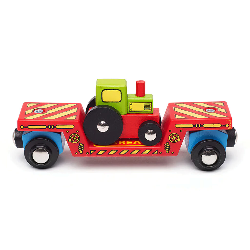 Táto krásna hračka má dvojaké využitie! Deti sa môžu hrať s traktorom a zároveň nabiehať a prevážať na ťažkotonážnom vagóniku drevenej vláčikodráhy. Vagónik má tiež magnetické spojky, ktoré zaisťujú ľahké prepojenie s ďalšími vagónikami alebo lokomotívou.