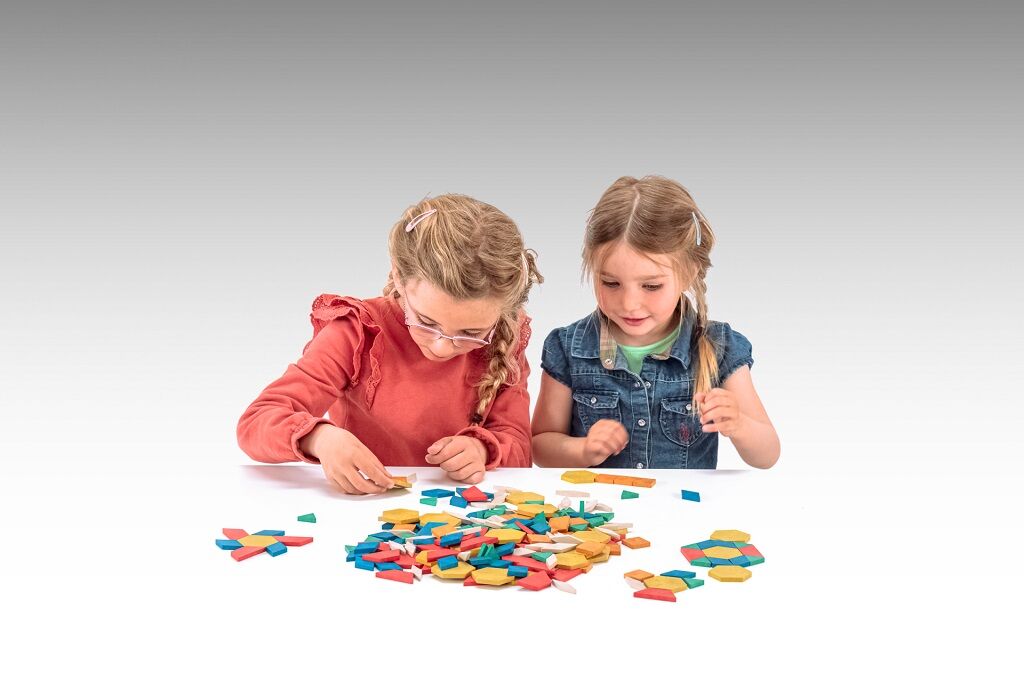 250 ks farebných dielikov v 6 geometrických tvaroch, ktoré slúžia na hranie i učenie sa o tvaroch a farbách. Zapojte svoju kreativitu a zložte si 3D obrázky. Ozdoby, zvieratá, čísla, ornamenty či mandaly. Dieťa si osvojuje objavovanie symetrie a pomenovanie rôznych tvarov a povrchov. Balenie obsahuje 25 žltých šesťuholníkov, 25 oranžových štvorcov, 50 červených lichobežníkov, 50 zelených trojuholníkov, 50 modrých rovnobežníkov a 50 béžových kosoštvorcov. Vyrobené zo 100% recyklovaných materiálov, má certifikáciu PEFC a po použití ho možno opakovane recyklovať.
