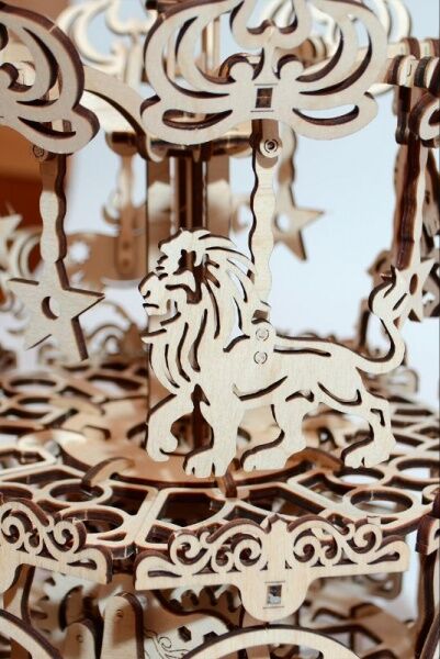 Stavebnica klasického kolotoče z preglejky. Skladačka je dodávaná v nezloženom stave, balená v krabici. Vybavené detailným návodom na zostavenie.